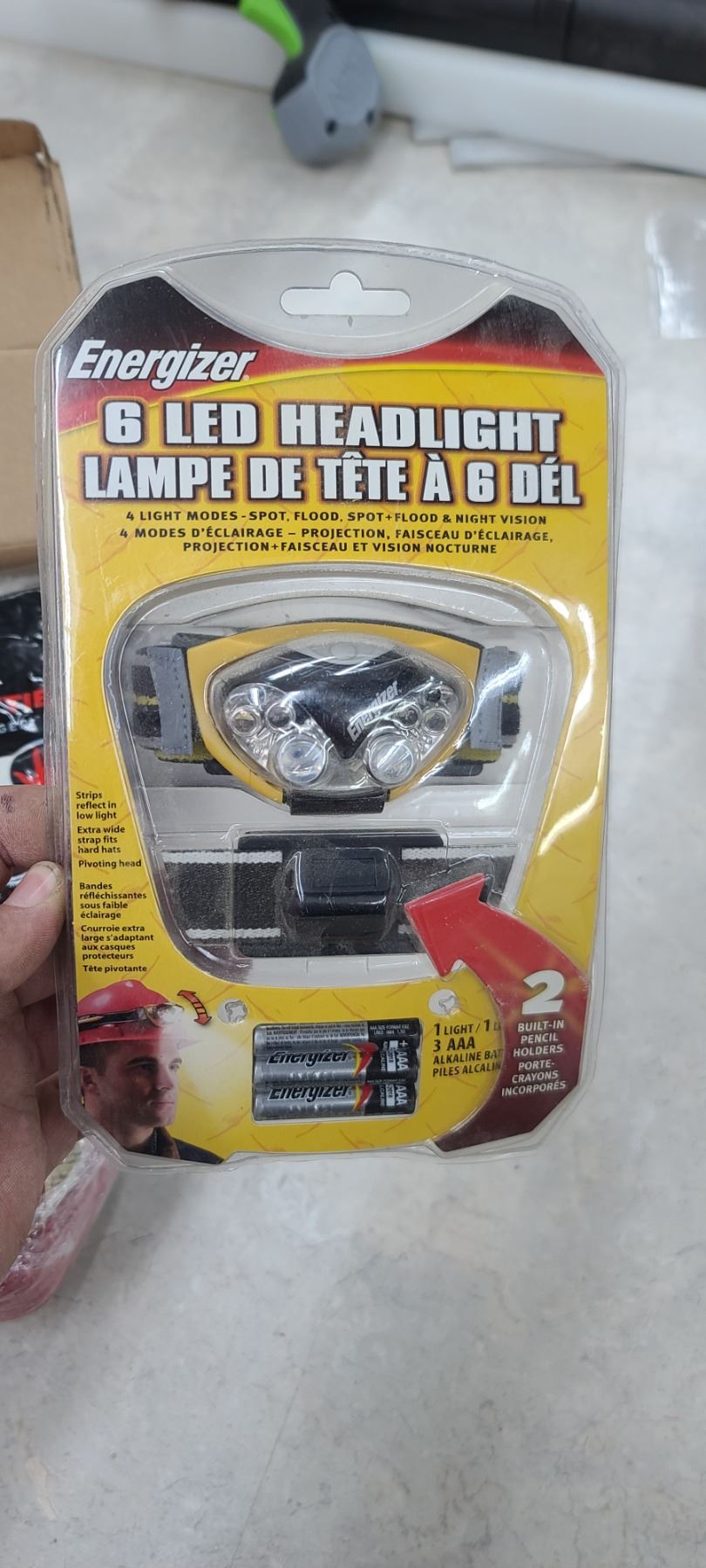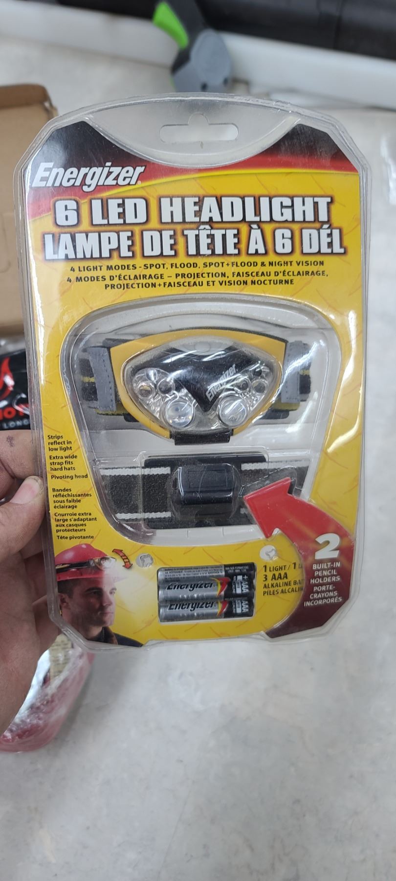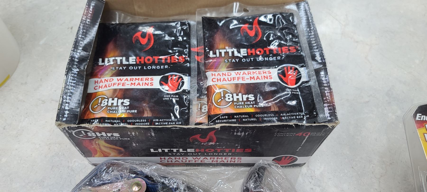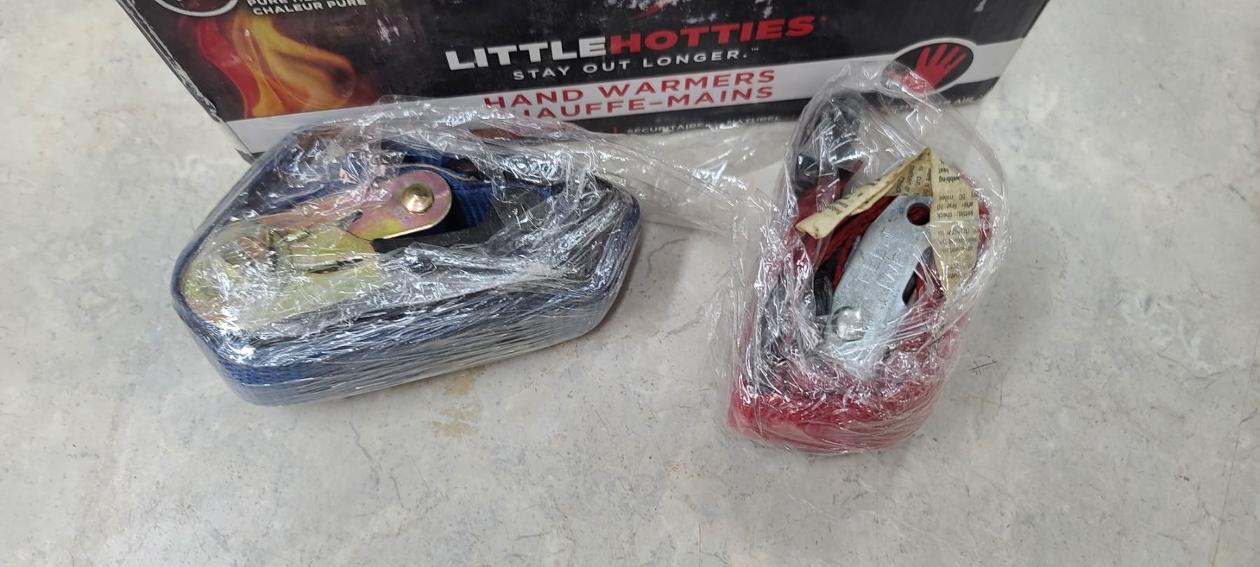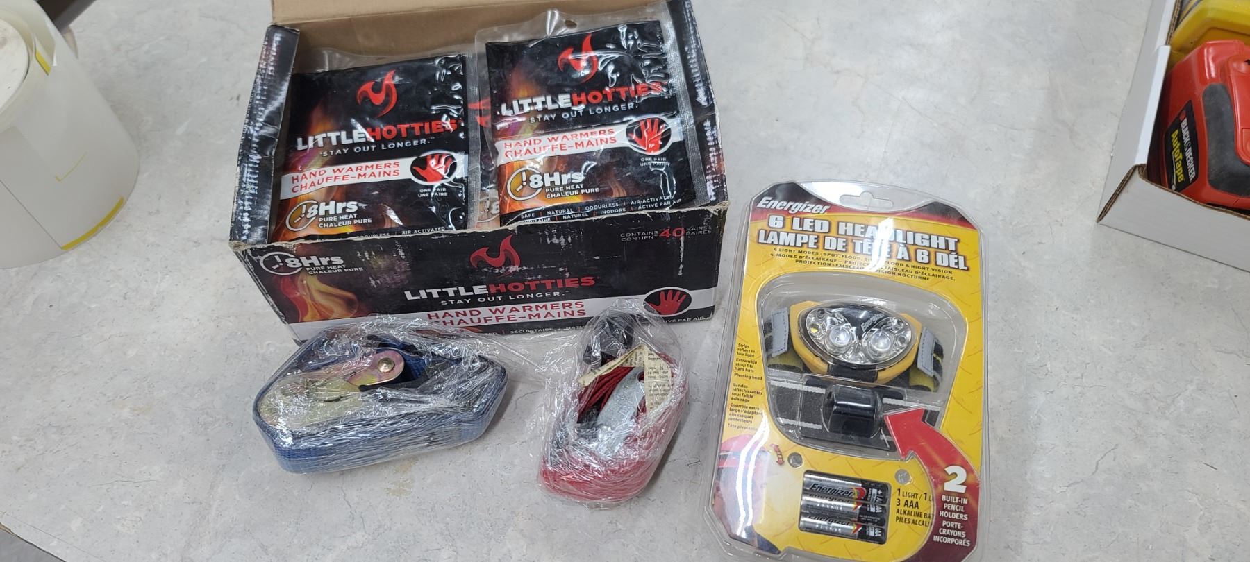 BOX OF HAND WAMERS - NEW LED HEADLAMP AND TWO RATCHET STRAPS