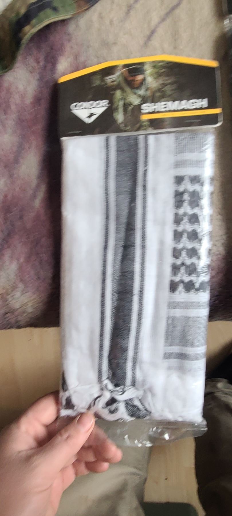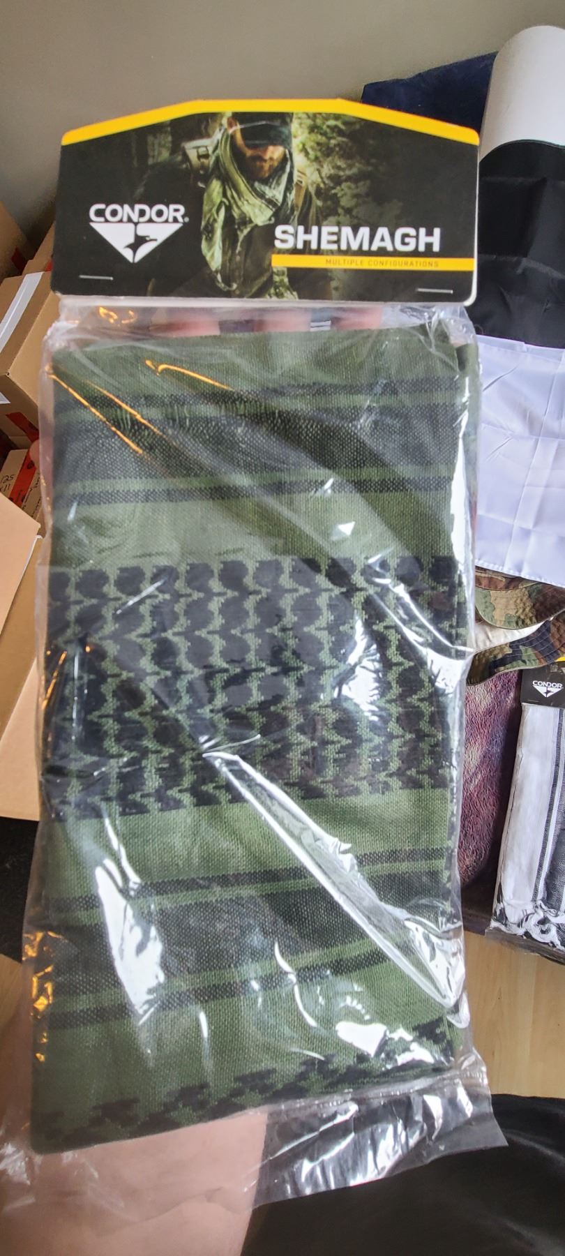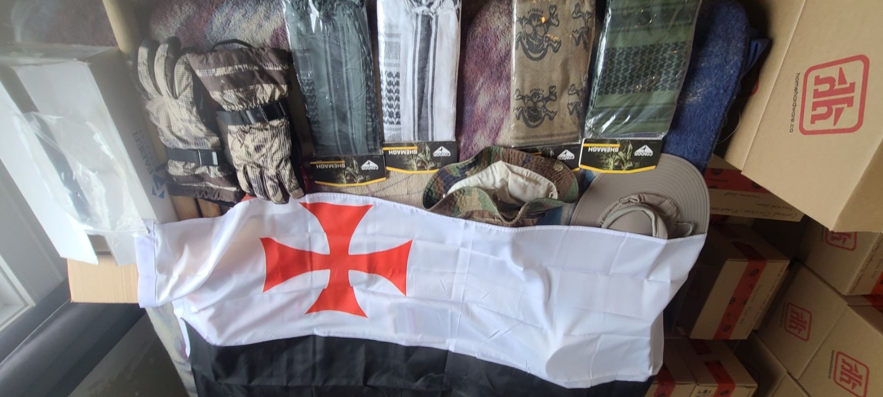BOX OF HATS, GLOVES AND FOUR NEW SHEMAGH
