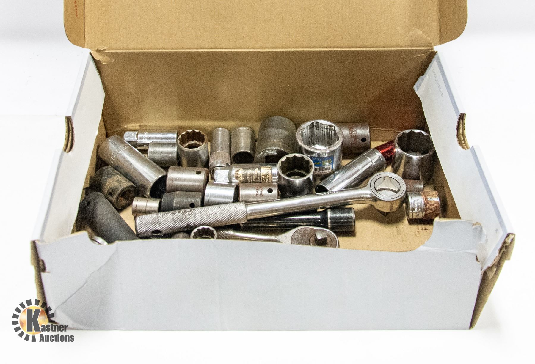 BOX OF HD SOCKETS, 1/2 AND 3/8 RATCHET DRIVES PLUS