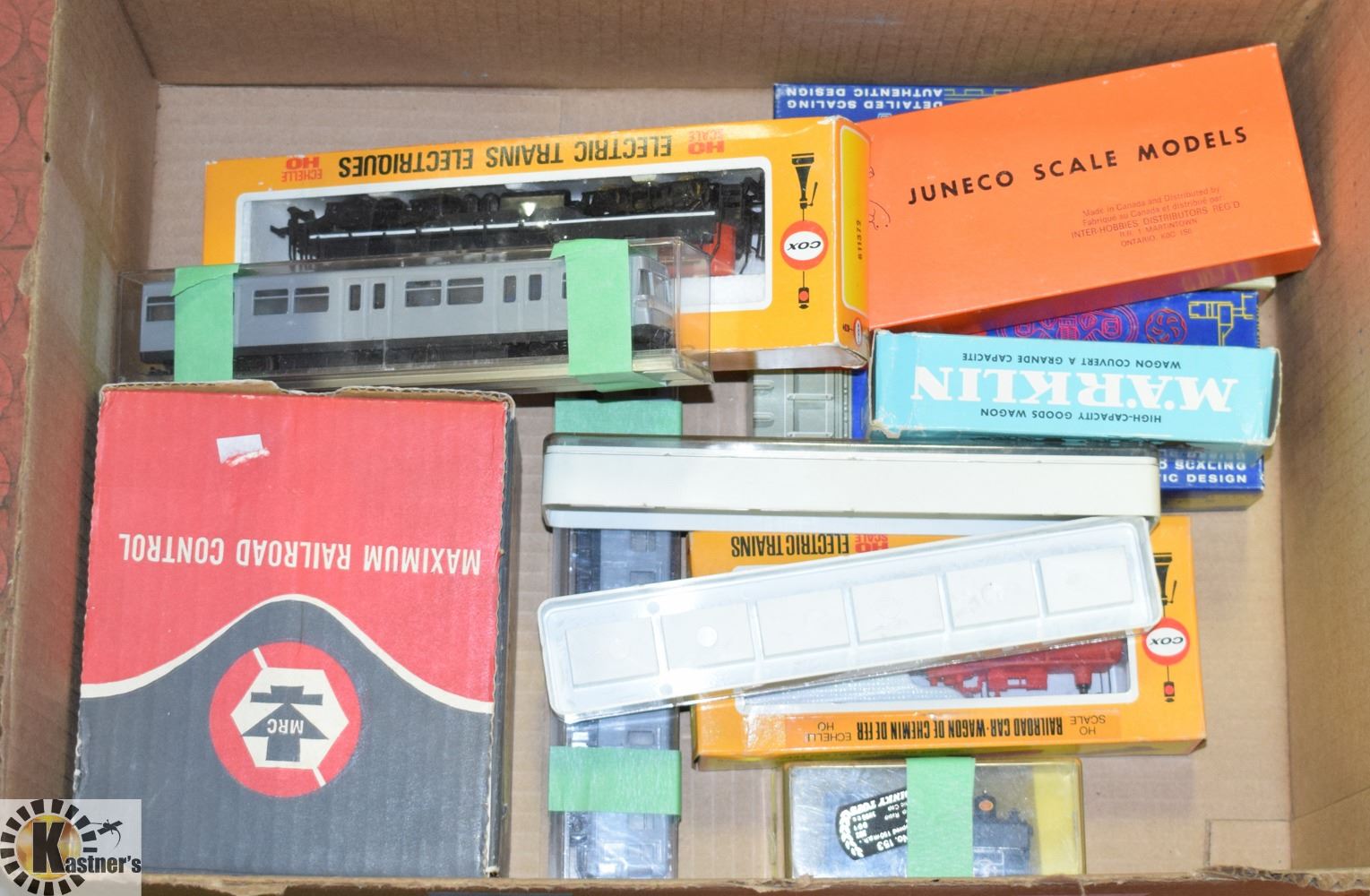 BOX OF HO SCALE TRAIN CARS AND CONTROLLER