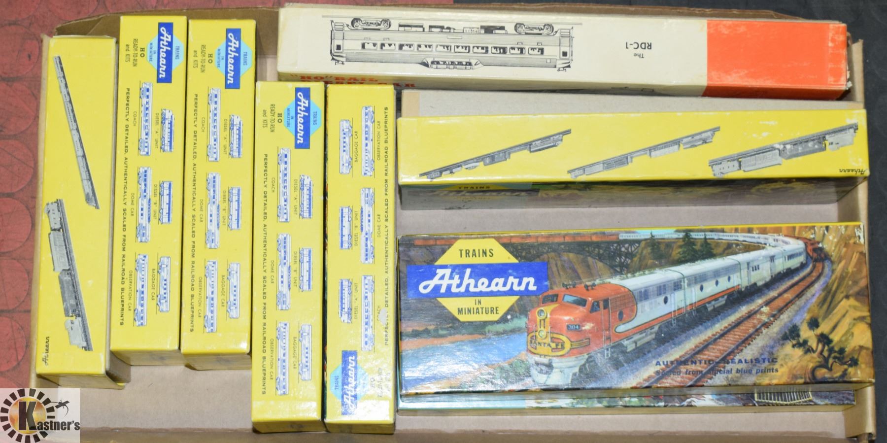 BOX OF HO SCALE TRAIN CARS AND ENGINES