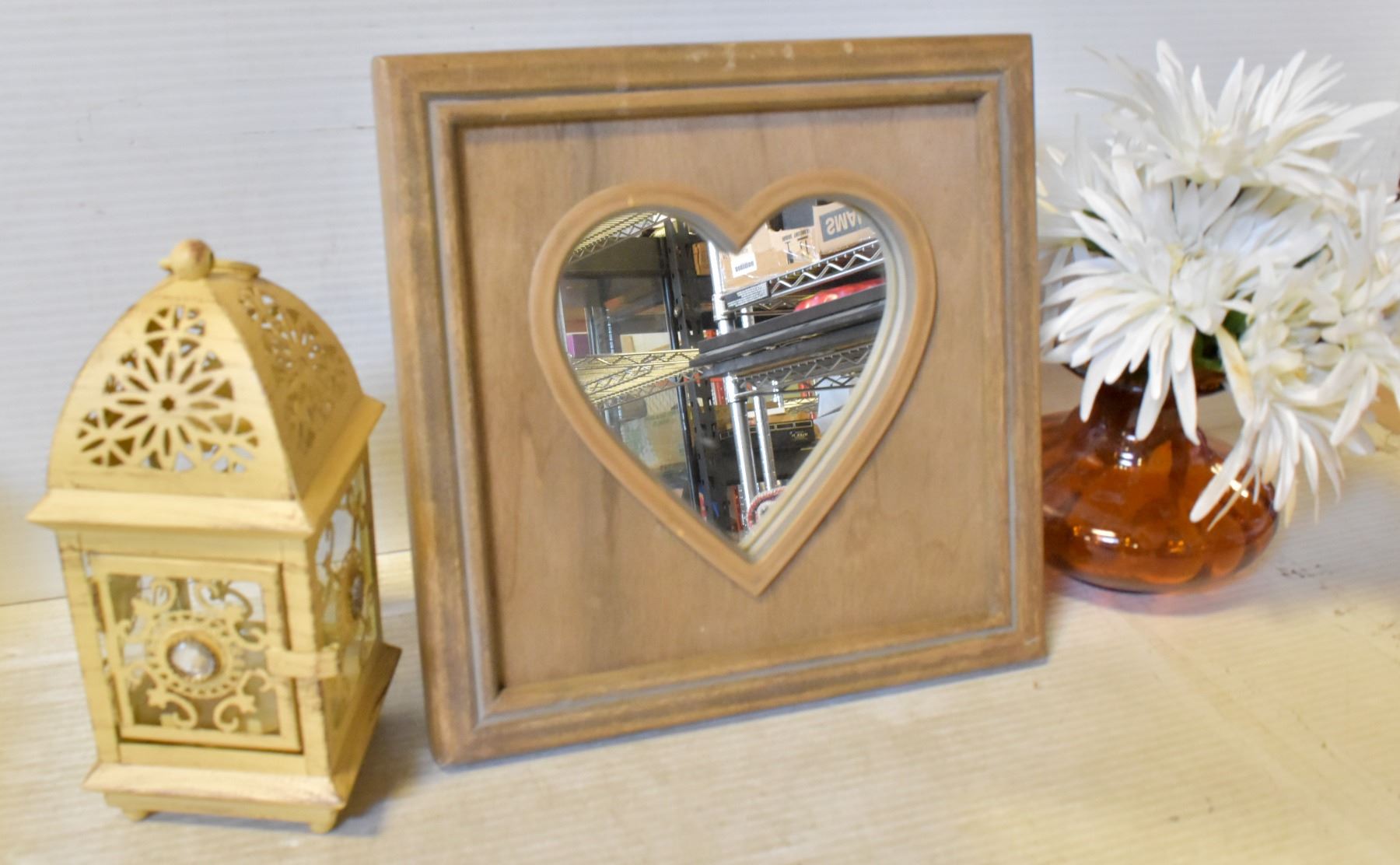 WOODEN HEART MIRROR; METAL LANTERN; AMBER GLASS VASE; NEW ARTIFICIAL FLOWERS