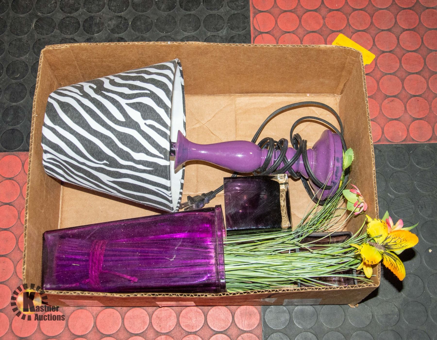 ZEBRA SHADE, PURPLE GLASS VASE WITH DRY ARRANGEMENT AND PURPLE GLASS CANDLE HOLDER **ALL ITEMS MUST BE REMOVED BY 5PM SATURDAY, DECEMBER 7TH 2024. ALL REMAINING ITEMS WILL BE SUBJECT TO A $6.00 PER DAY STORAGE CHARGE. ANY ITEMS REMAINING AFTER MONDAY, DECEMBER 23RD 2024 WILL BE CONSIDERED FORFEITED. NO REFUNDS WILL BE ISSUED FOR FORFEITED ITEMS. TO SCHEDULE A PICK UP APPOINTMENT CLICK HERE