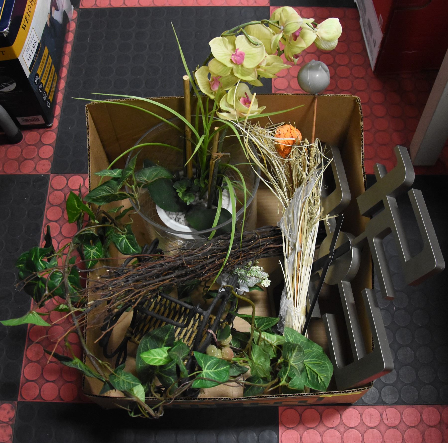WINE RACK WRAPPED IN GRAPE VINE, LARGE ETCHED GLASS VASE WITH DECORATIVE SILK FLOWERS, BUNDLES OF DECORATIVE STOCKS, LARGE GOLD AND BLACK WALL CLOCK