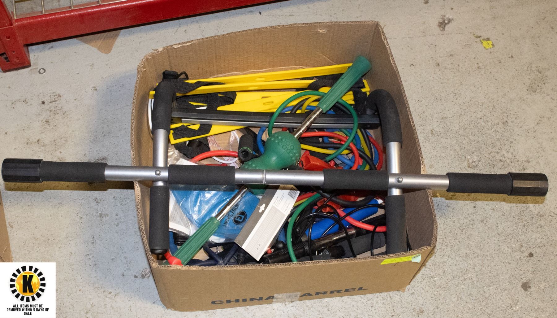 CHIN UP/WORKOUT BAR, SEVERAL SETS OF RESISTANCE BANDS, BACK MUSCLE ROLLER, ETC.