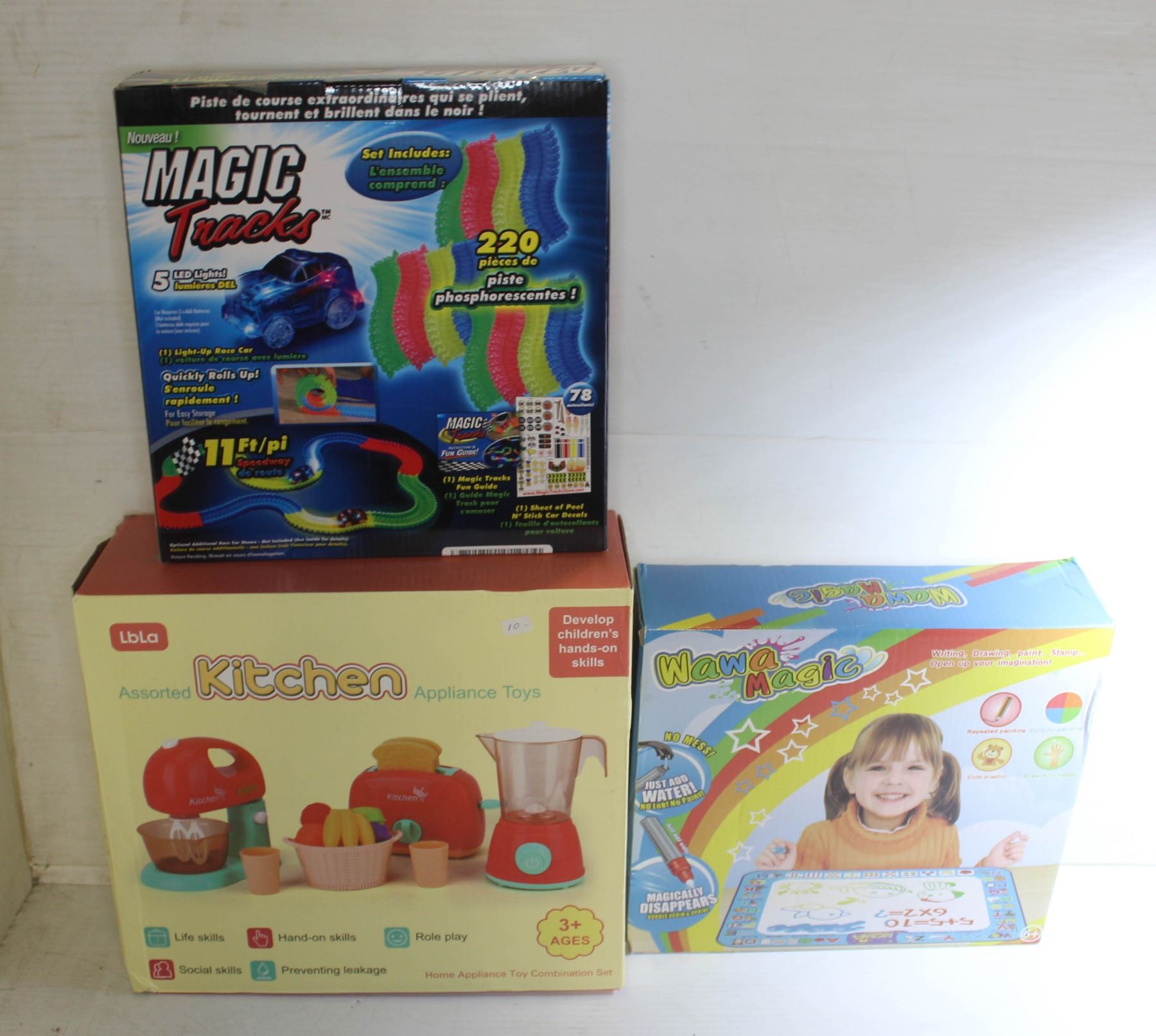 MAGIC WRITING PAD, GLOW IN THE DARK TRAX N VEHICLE, KIDS KITCHEN APPLIANCES SET