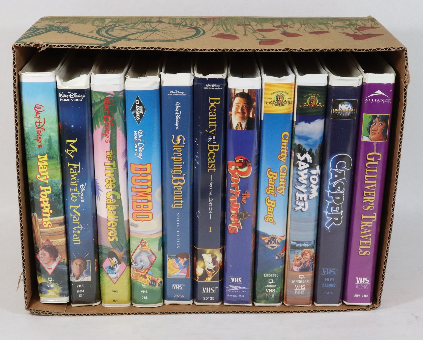 BOX OF KIDS VHS TAPES, MANY DISNEY. INCLUDES DUMBO