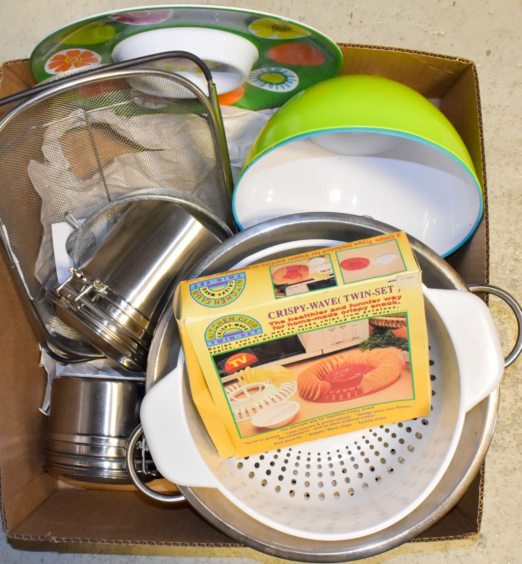 WAVE CHIP MAKER SET, STAINLESS STEEL EXPENDABLE SINK STRAINER, 2 STAINLESS STEEL CANISTERS, LARGE MIXING/SERVING BOWLS, CHIP & DIP TRAY, LARGE STAINLESS STRAINER, ETC.