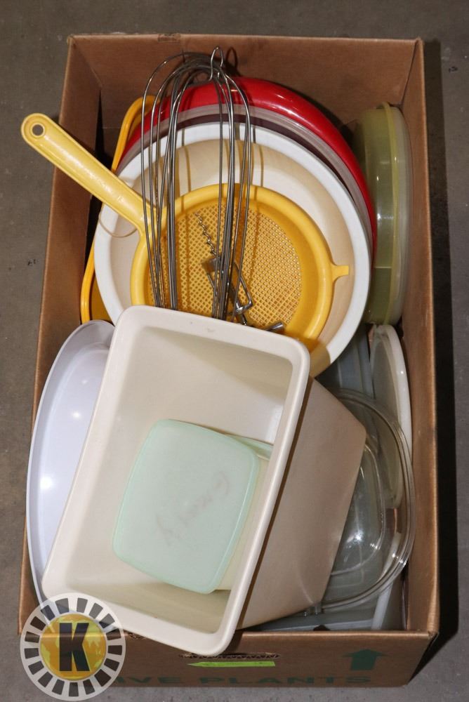 BOX OF KITCHEN BOWLS, WHISKER, AND MORE