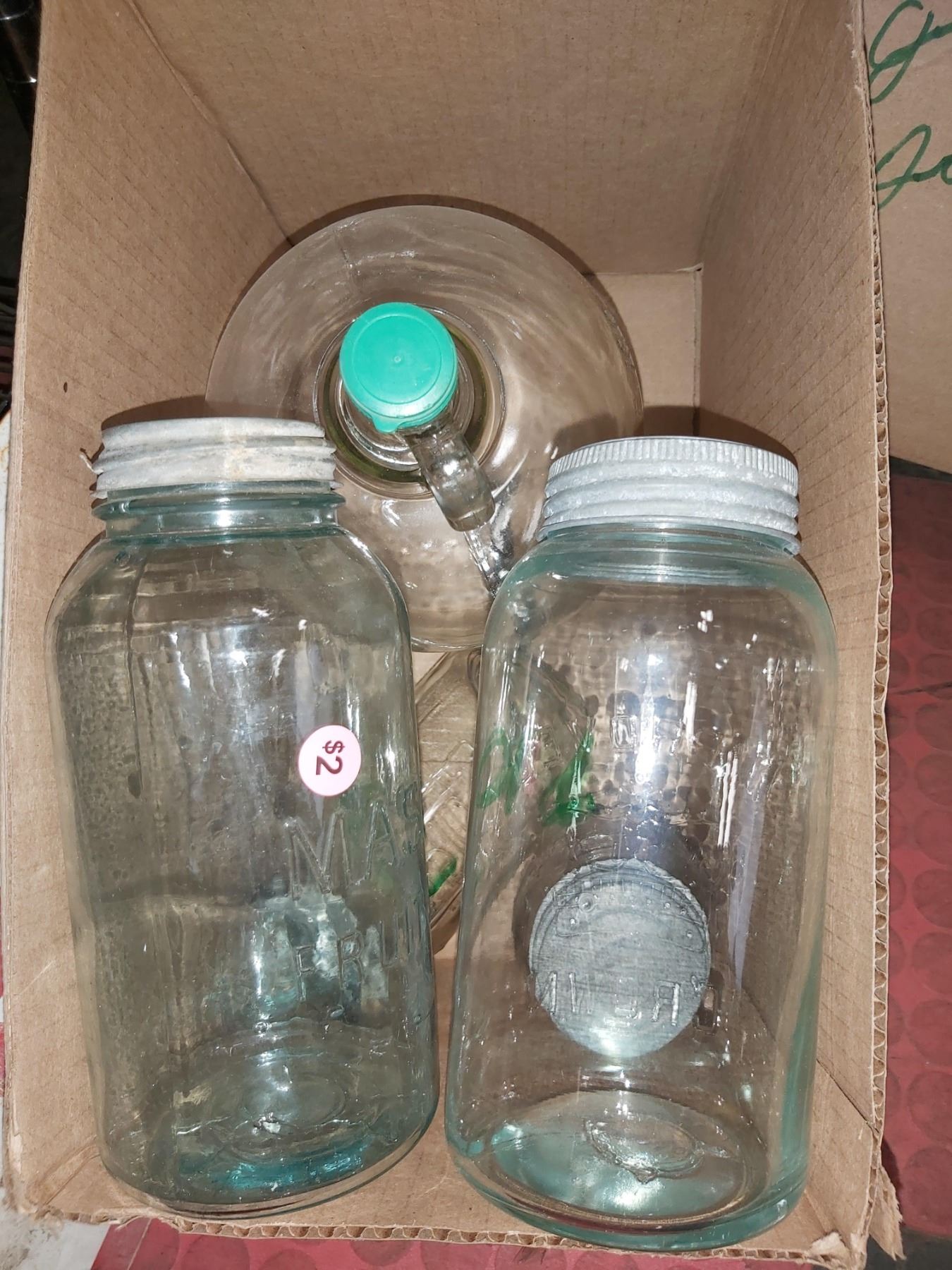 BOX OF LRG ANTIQUE MASON JARS W/ GLASS SEALERS