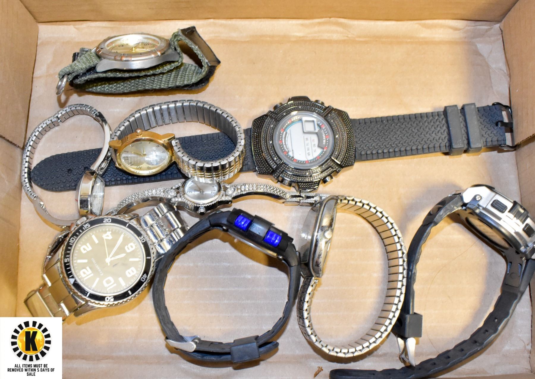 BOX OF MENS AND LADIES WATCHES (NEEDS BATTERIES)