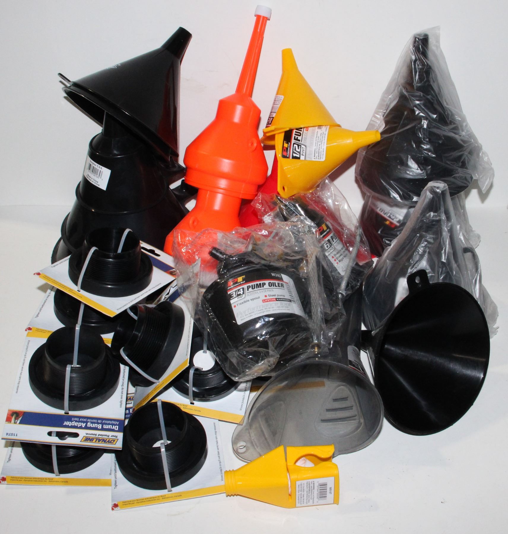BOX OF MISC AUTOMOTIVE ITEMS INCLUDING FUNNELS,