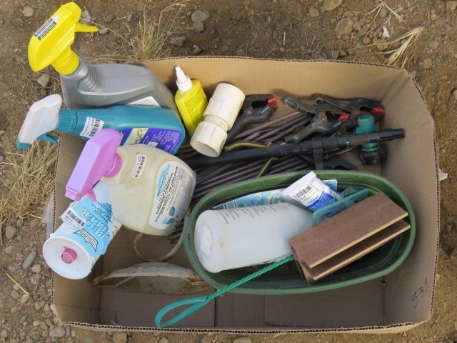 BOX OF MISC CLAMPS, WALL BRACKETS, RODS, CONNECTORS, SPRAY BOTTE, ETC