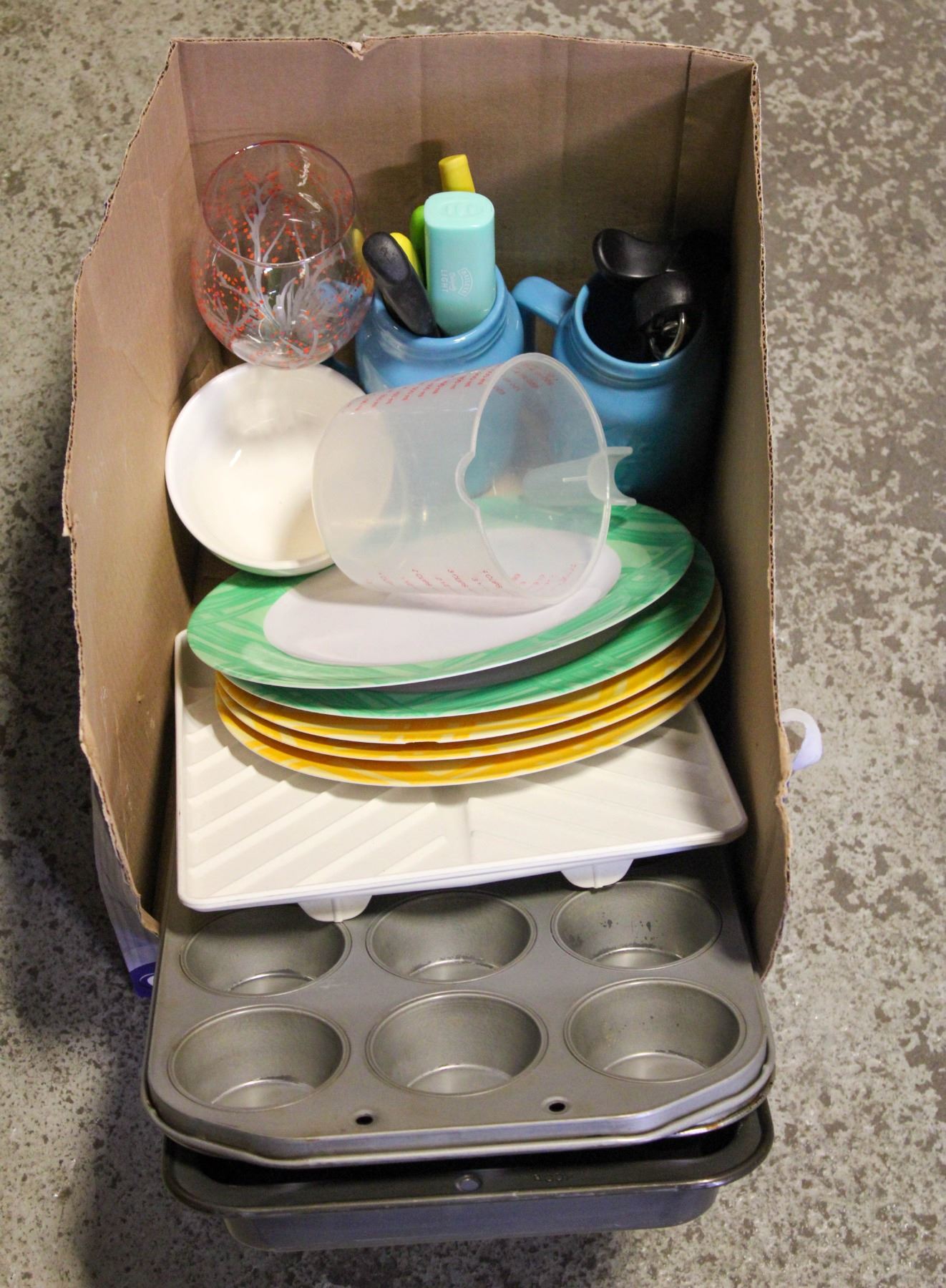 3 PARING KNIVES W COVERS, CAN OPENER, MILK FROTHER, 2 MUFF TINS, 9X13 CAKE PAN, MICROWAVE BACON TRAY, 5 PLATES, BOWL