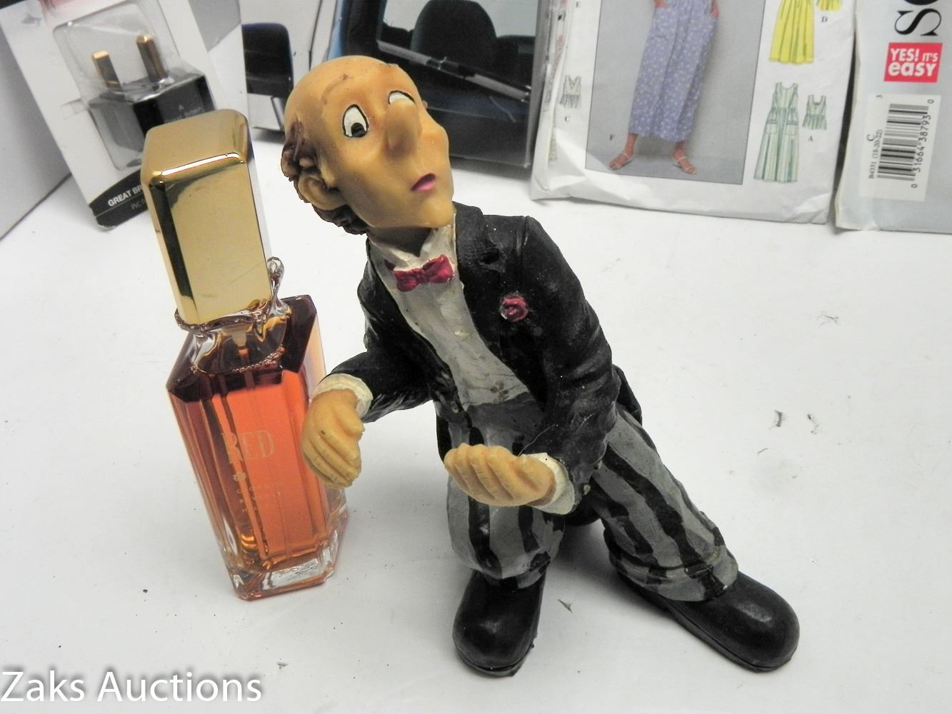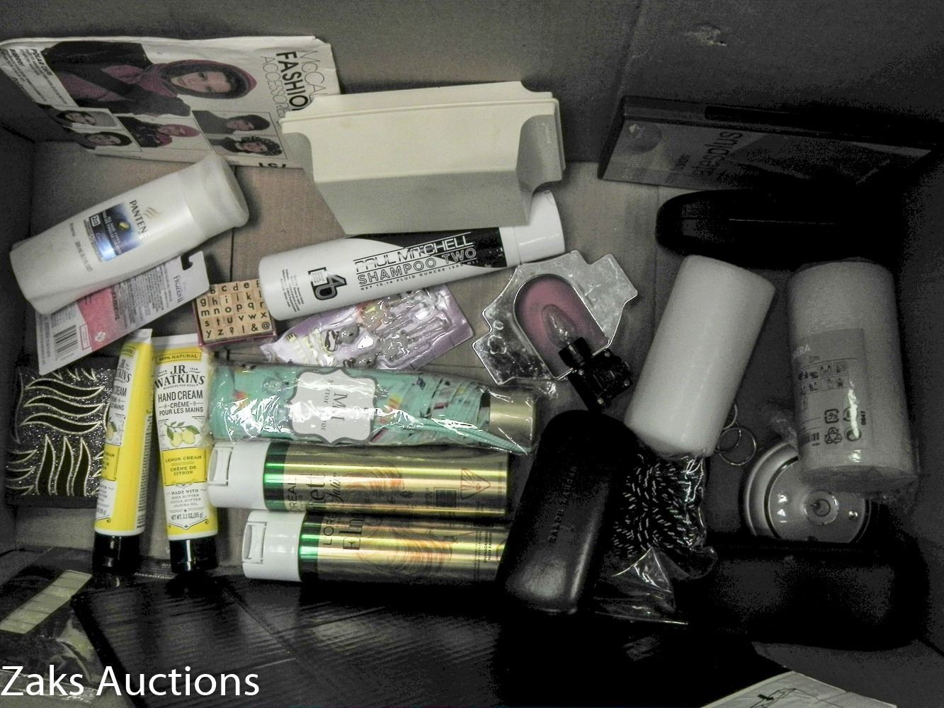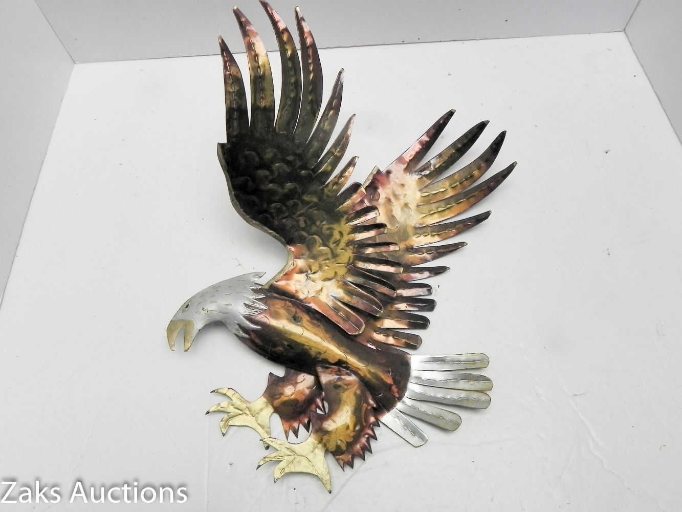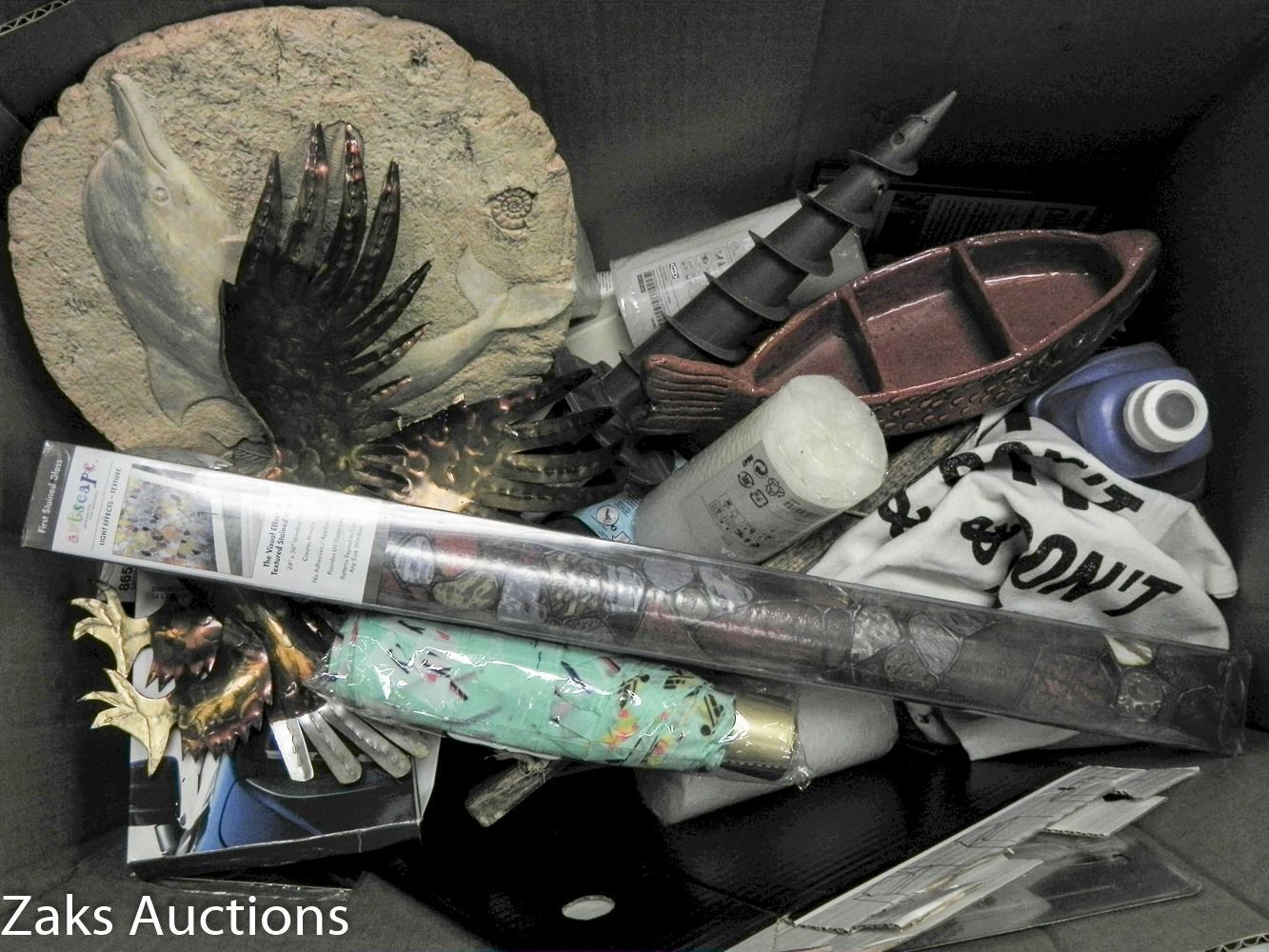 BOX OF MISC DECOR, CANDLES, FAUX STAINED GLASS WINDOW OVERLAY, COPPER EAGLE, ETC