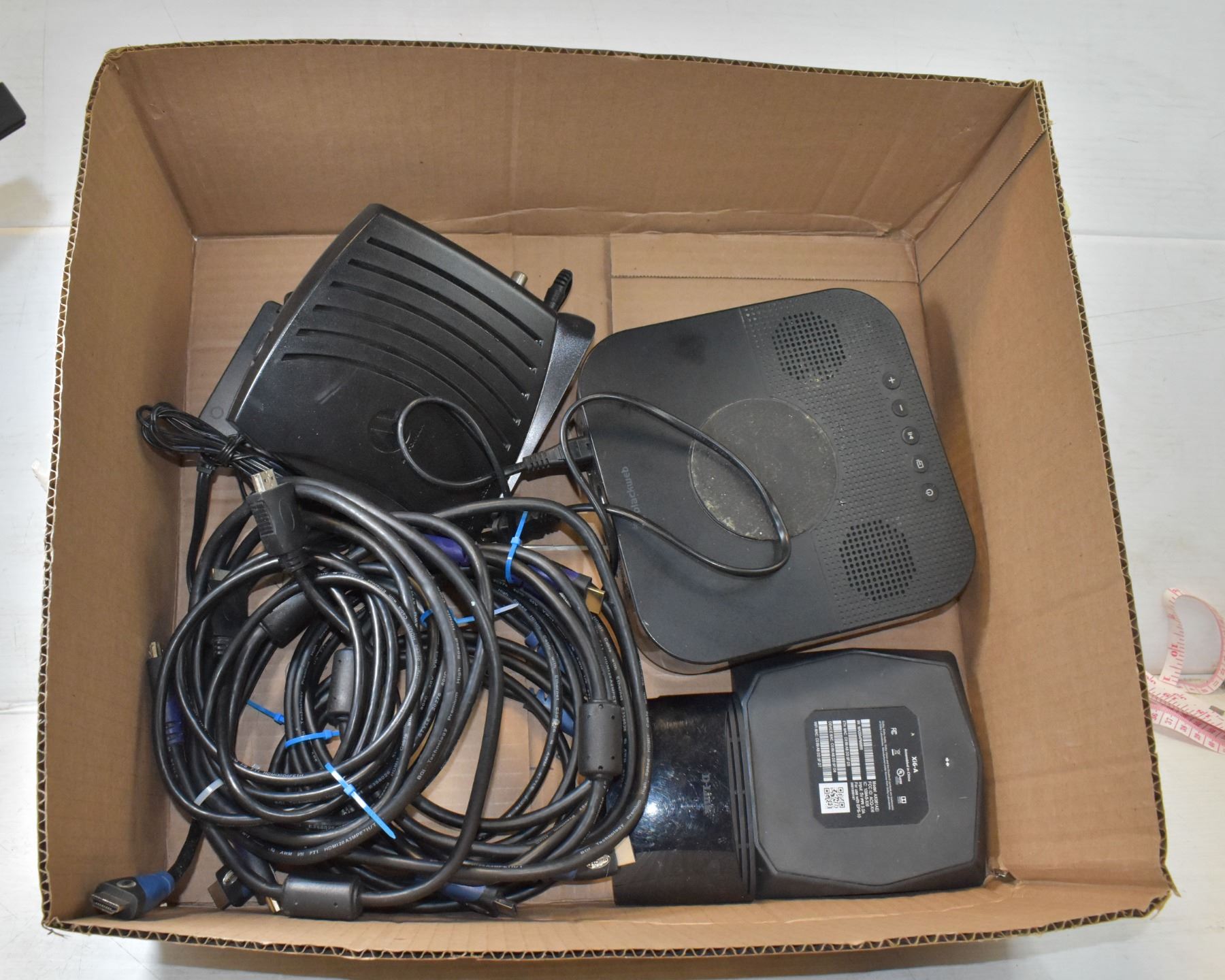 SURFBOARD, WIRELESS ROUTER, BLACKWEB SOUND BLOCK, CLOCK RADIO BWA18 AA 002C, D-LINK 5 LINE HUB, MODEL XI6-A, 6 HDMI CORDS, ETC.