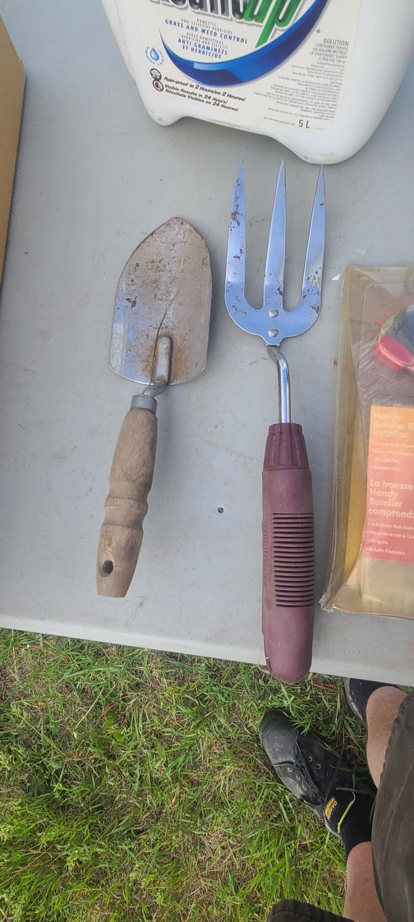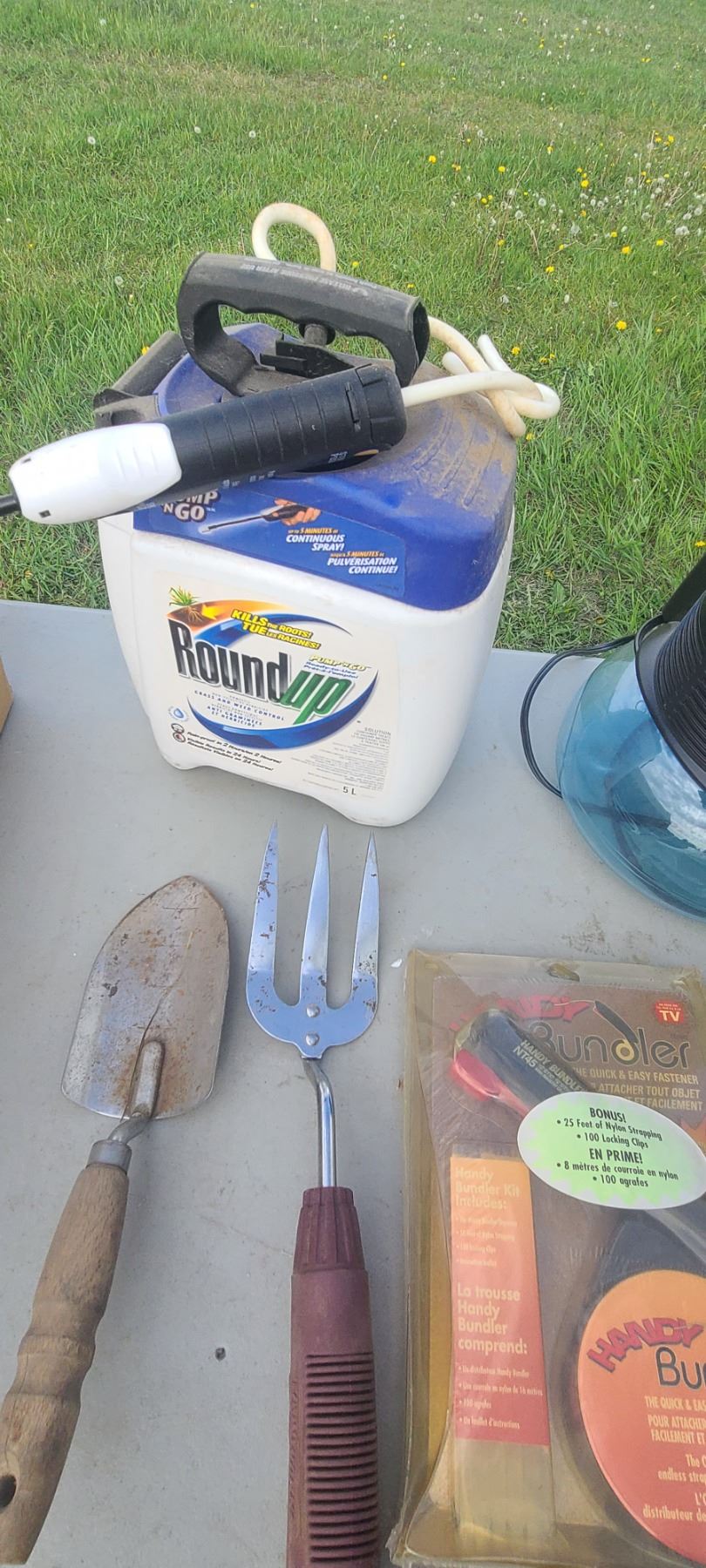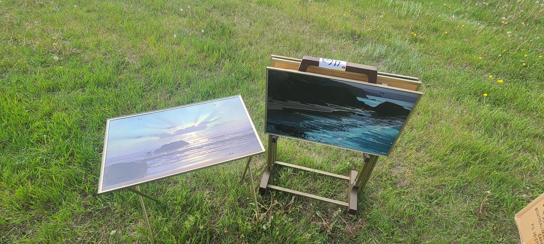 BOX OF MISC. GARDEN SUPPLIES, TV TRAYS, ETC.