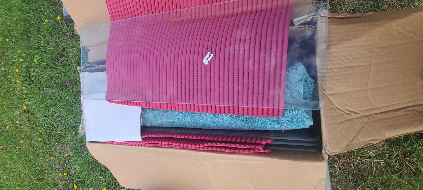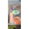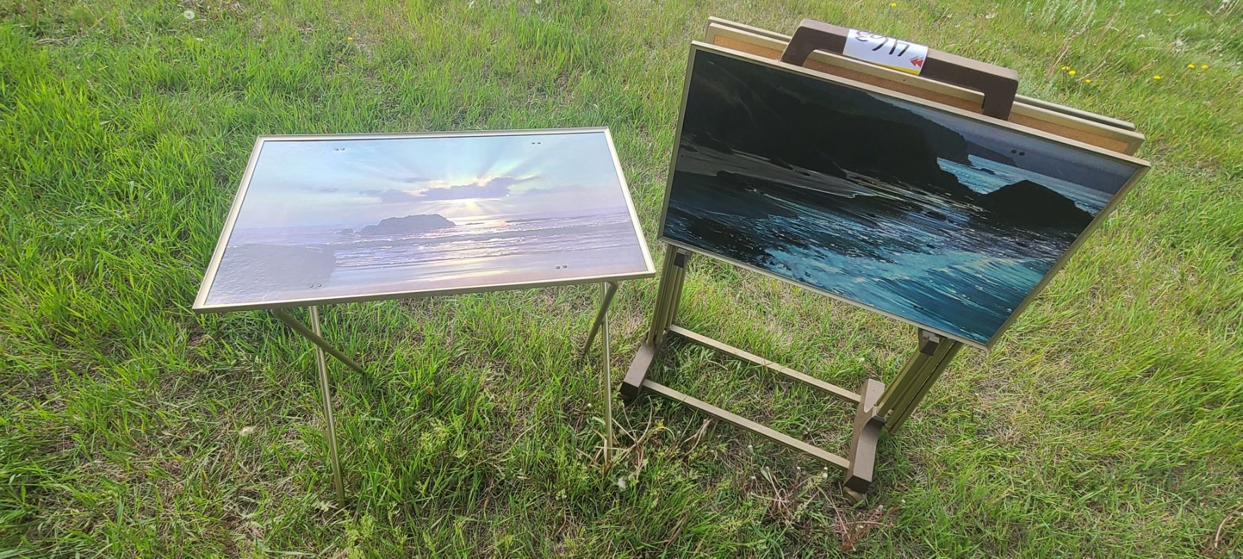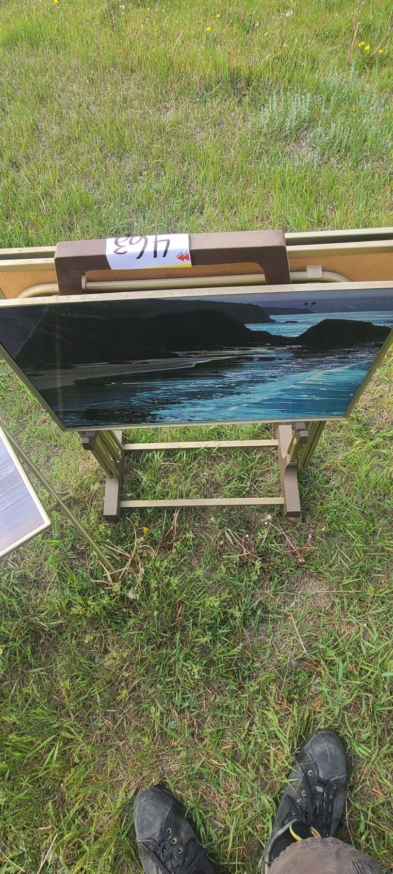 BOX OF MISC. GARDEN SUPPLIES, TV TRAYS, ETC.