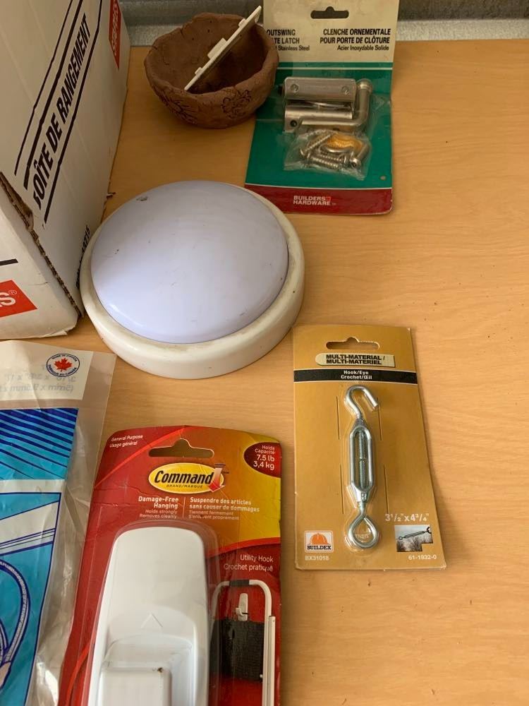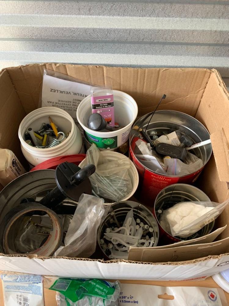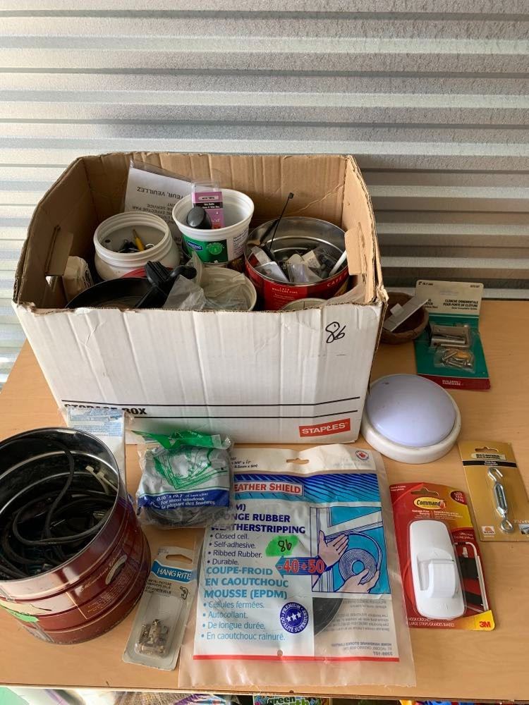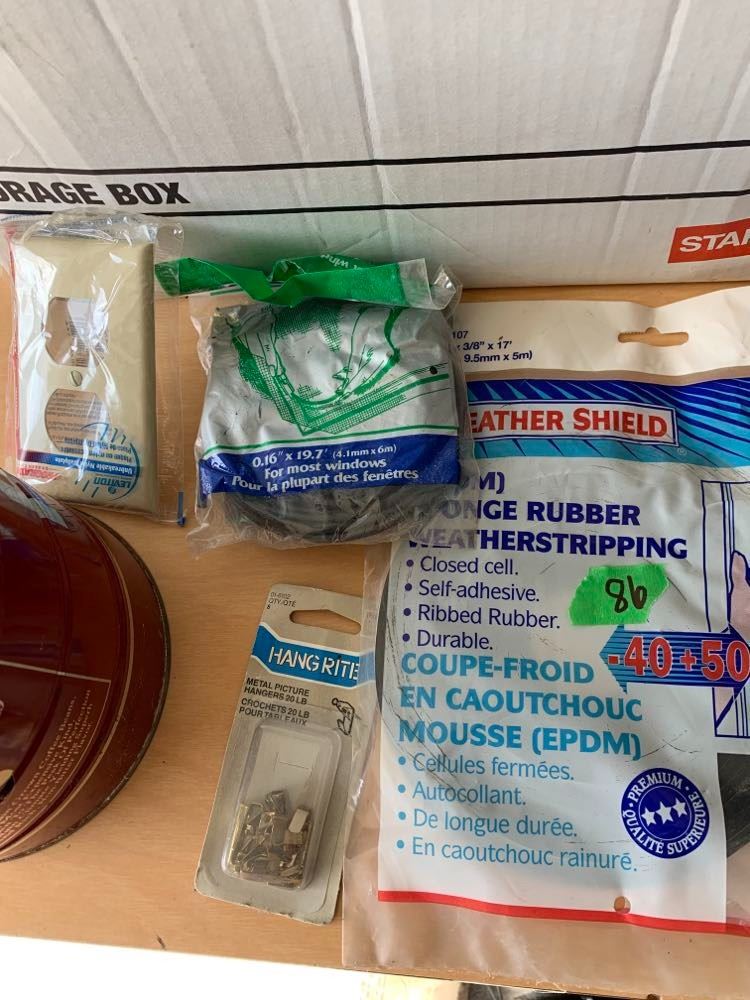 BOX OF MISC HARDWARE. DECK SCREWS, DECK NAILS, WINDOW WEATHER STRIP