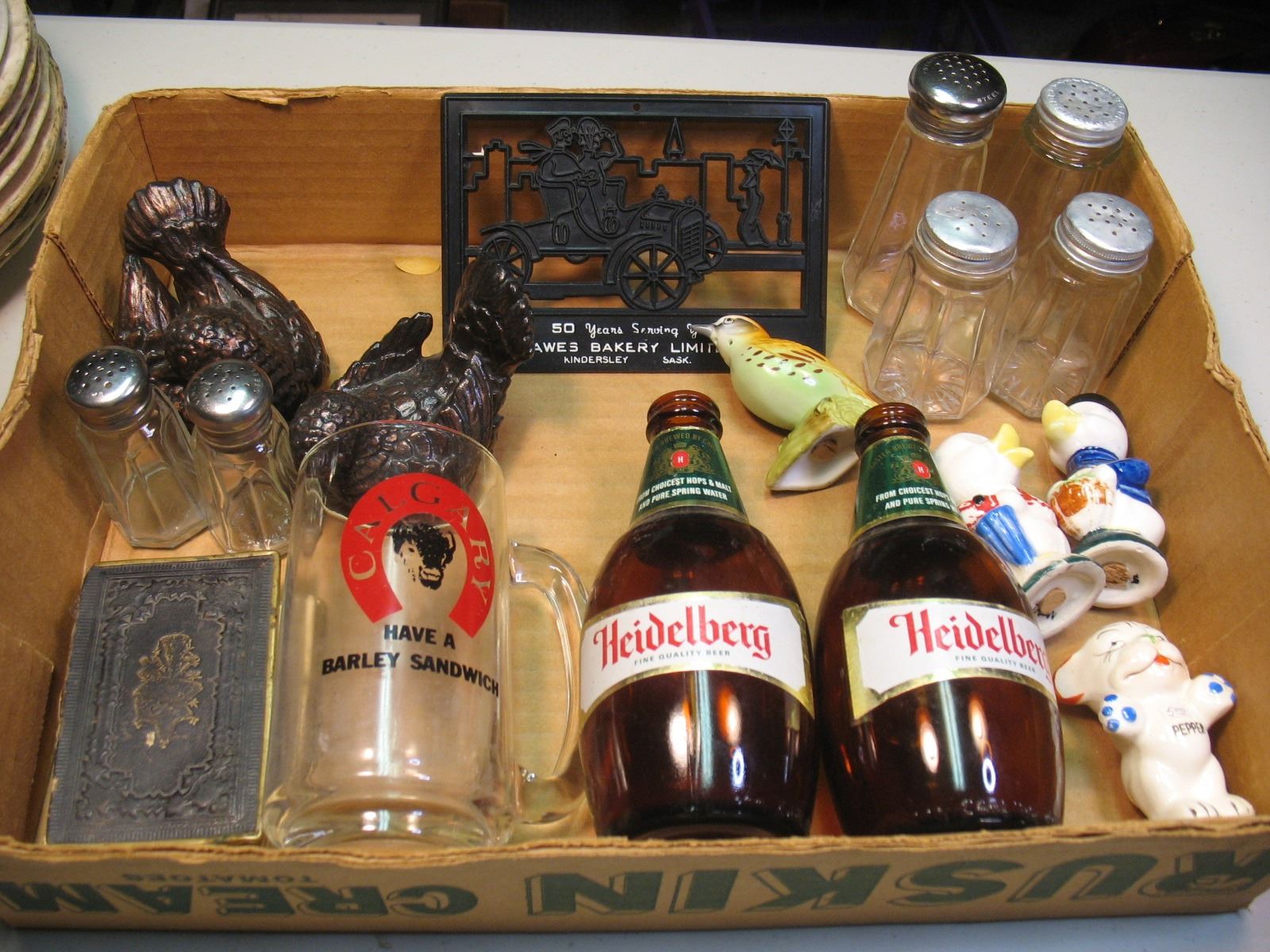 BOX OF MISC ITEMS - SALT & PEPPER - HEIDELBERG BOTTLES - KINDERSLEY BAKERY PLAQUE