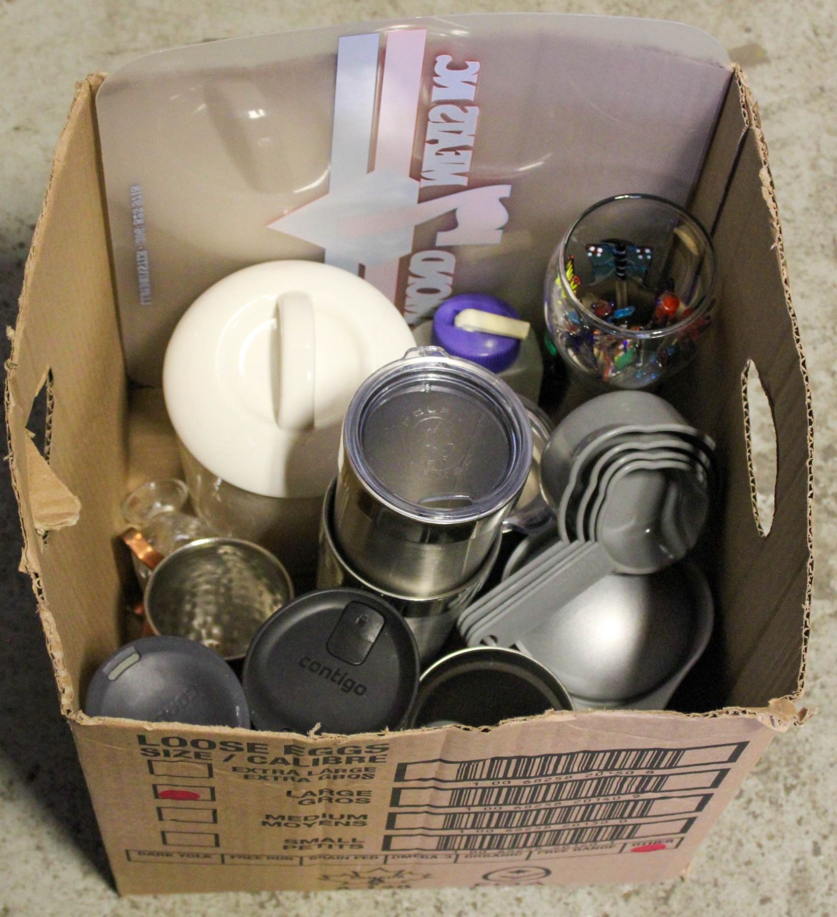 PLASTIC MEASURE CUPS&SPOONS, GLASS DRINK SWIZZLE STICKS, 2 CONTIGO MUGS, CORKSCREW, LIDDED CANISTER, TRAVEL MUGS