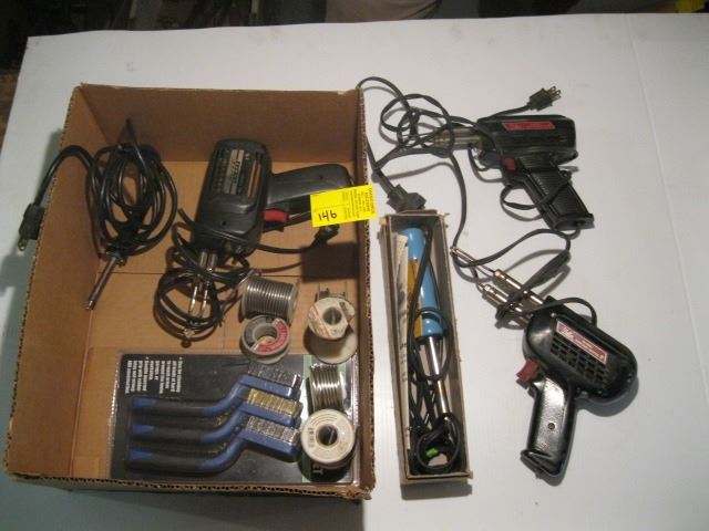 BOX OF MISC. SOLDERING IRONS & GUNS, SOLDER, ETC.