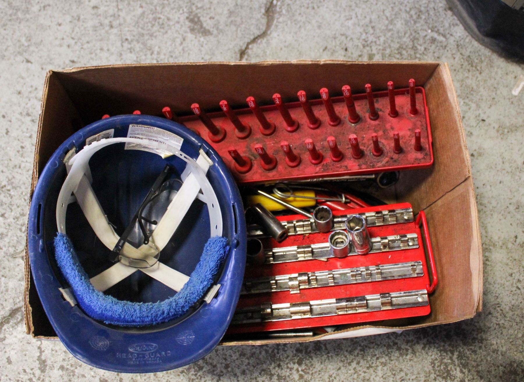 BOX OF MISC TOOLS, HARD HAT, SOCKETS