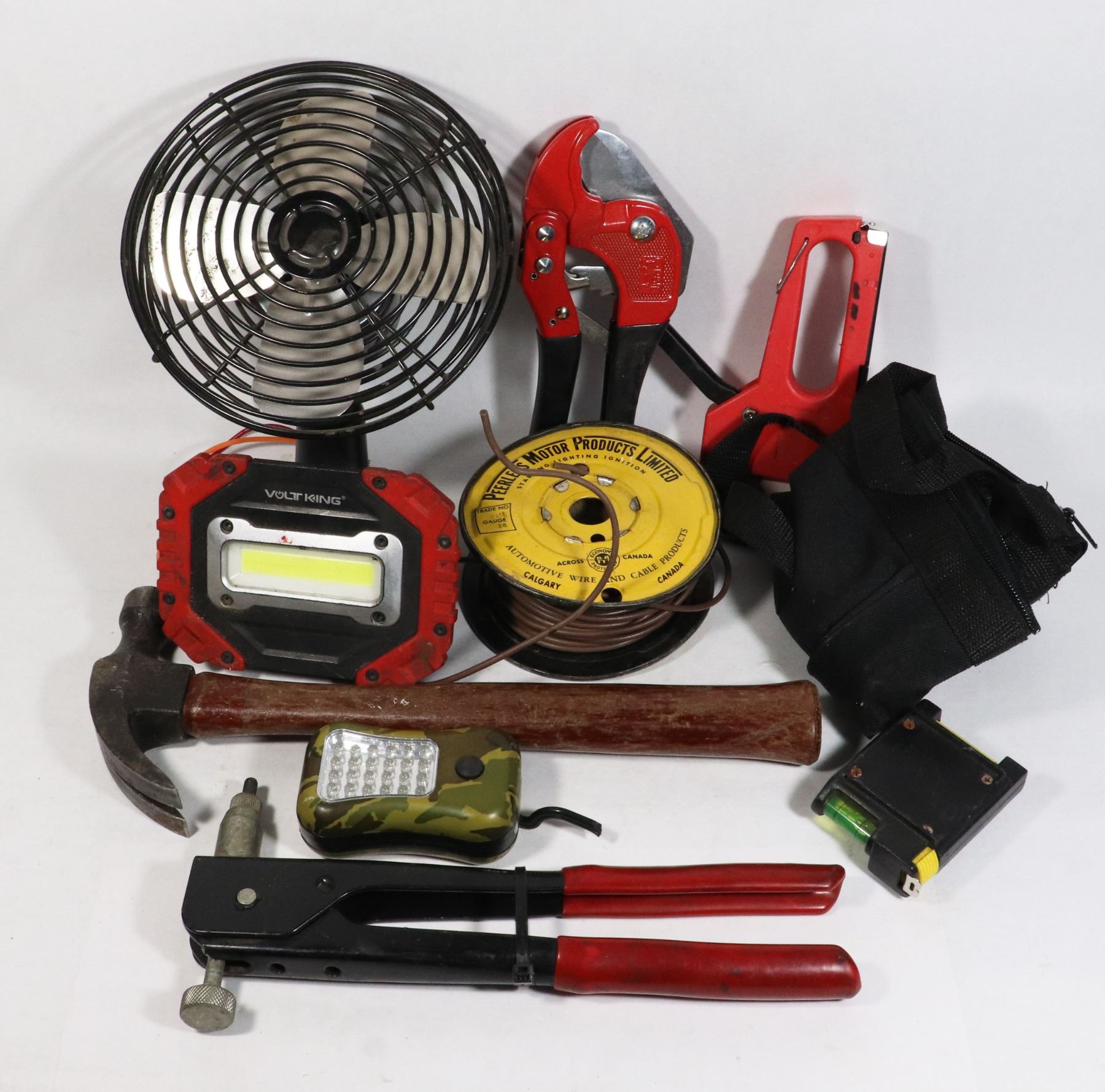 BOX OF MISC TOOLS INCLUDING RIVETER, HAMMER, SMALL