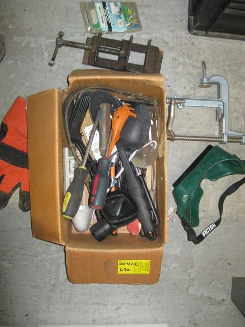 BOX OF MISC WELDING GOGGLES, SCREWDRIVERS, VISE ETC.