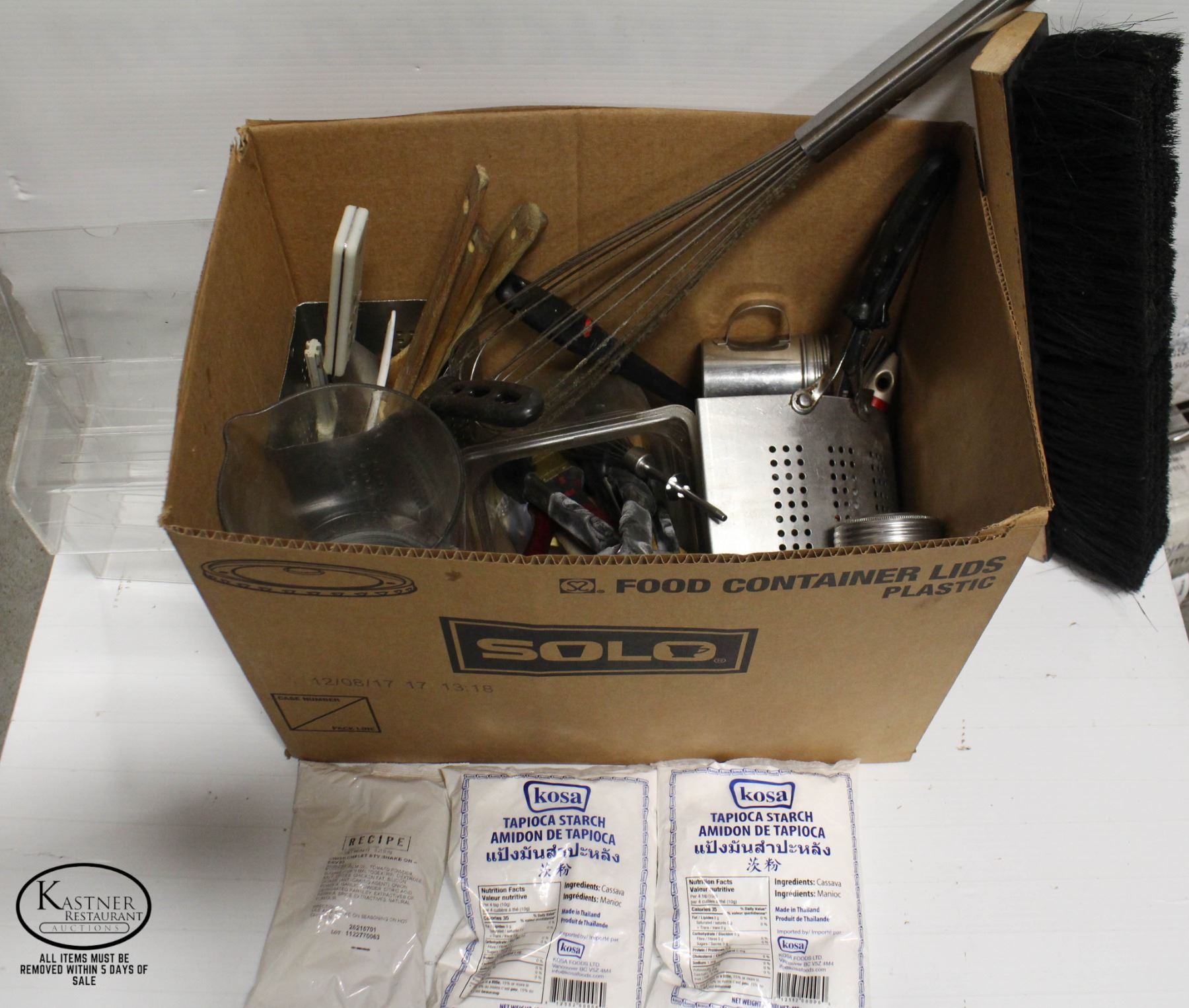 BOX OF MISCELLANEOUS KITCHEN ITEMS & UTENSILS
