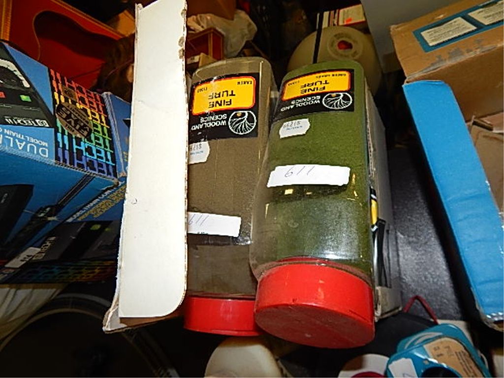 BOX OF MODEL TRAIN TURFF AND 2 TUBS OF TURFF