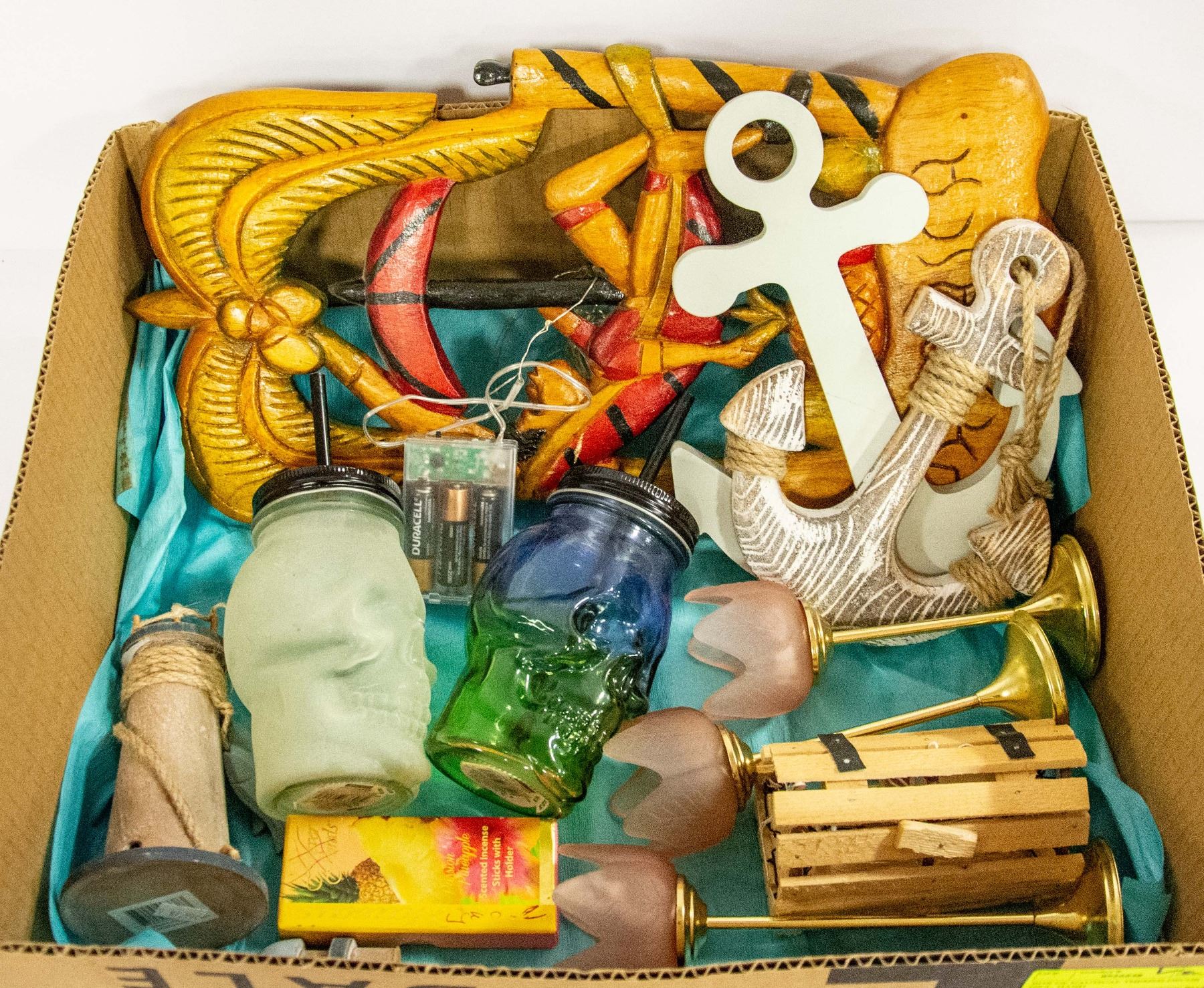 CARVED WOOD PALM TREE WALL ART, 2 SKULL SEALER MUGS, WOOD ANCHORS, LIGHTHOUSE, LOBSTER TRAP, TEALIGHTS, ETC.