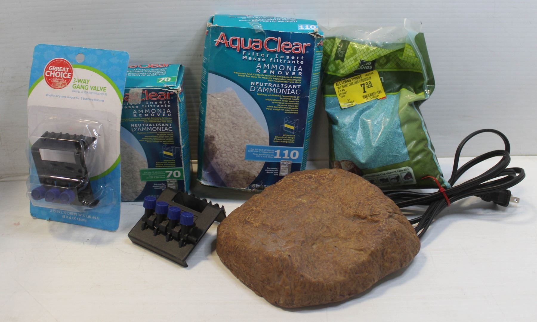 EXOTERA REPTILE HEAT ROCK, TURQUOISE CRAB SAND, 3-WAY AIR PUMP GANG VALVES, 2 BOXES OF FAQUACLEAR FILTER INSERTS