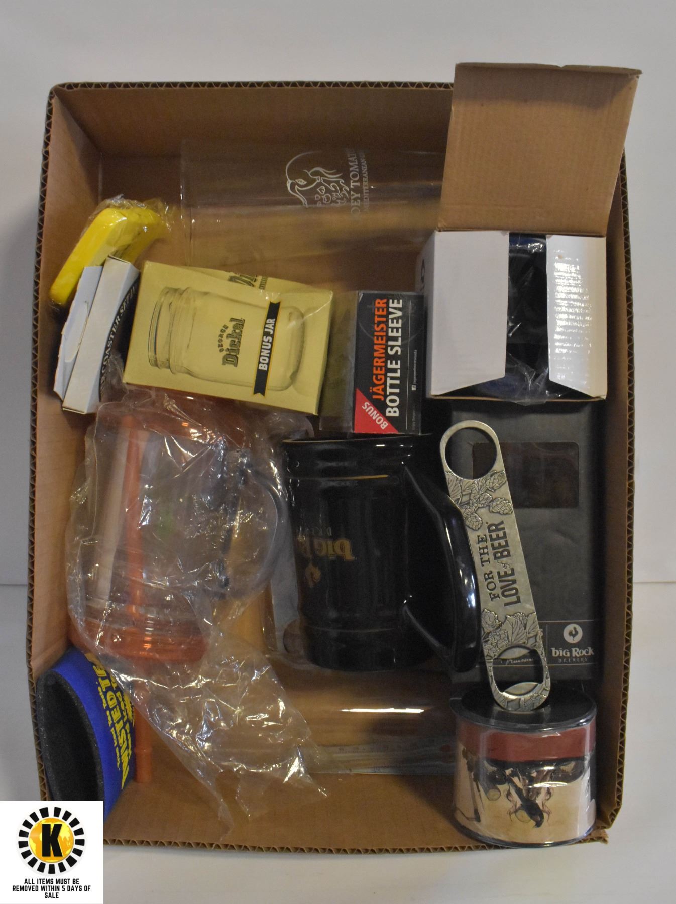 LEATHER COASTER SET, BBQ APRON, BIG ROCK CERAMIC BEER MUG, COORS AND SAM ADAMS BOTTLE OPENERS, CORONA EXTRA LIME CUTTER, TENNESSEE WHISKY JAR, BOTTLE SLEEVES, TALL BEER GLASSES, ETC.