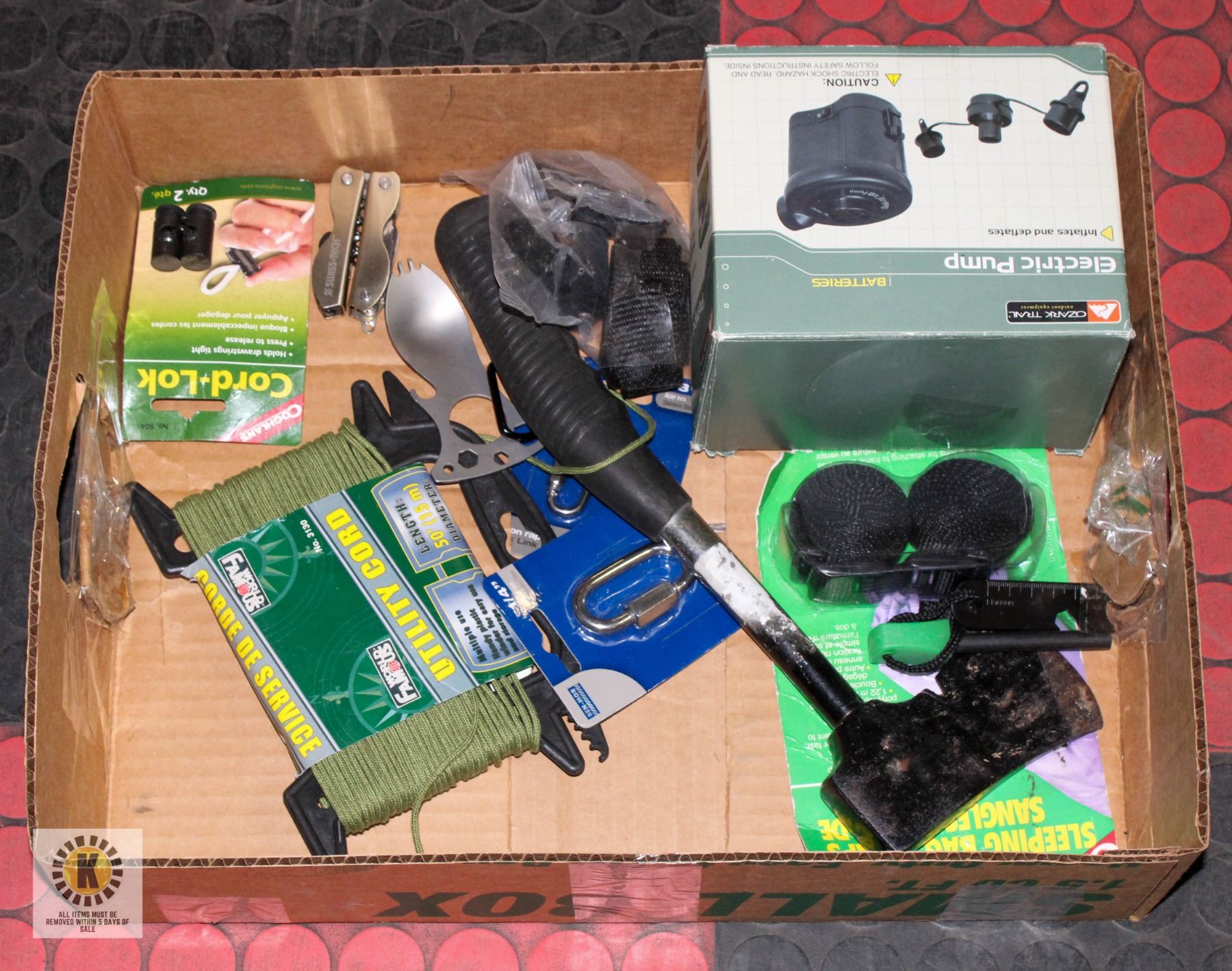 OZARK TRAIL ELECTRIC AIR PUMP - BATTERY POWERED, COLEMAN METAL HANDLE HATCHET WITH ERGONOMIC GRIP HANDLE, NEW 50 FOOT UTILITY CORD, NEW QUICK LINKS, NEW SLEEPING BAG STRAPS, SWISS TECH MULTI-TOOL, ETC. **ALL ITEMS MUST BE REMOVED BY 5PM SATURDAY, APRIL 3RD 2025. ALL REMAINING ITEMS WILL BE SUBJECT TO A $6.00 PER DAY STORAGE CHARGE. ANY ITEMS REMAINING AFTER MONDAY, MAY 19TH 2025 WILL BE CONSIDERED FORFEITED. NO REFUNDS WILL BE ISSUED FOR FORFEITED ITEMS. TO SCHEDULE A PICK UP APPOINTMENT CLICK HERE