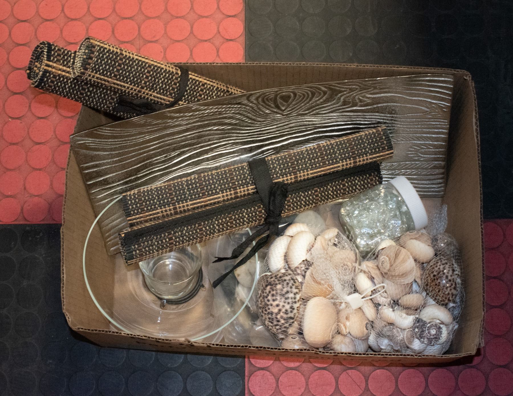 BOUCLAIR HOME RECTANGLE GLASS CENTER PIECE PLATE, 4 WOVEN BAMBOO PLACE MATTS, NEW CLEAR GLASS ELEVATED BOWL WITH CENTER PIECE CUP, TWO NEW BAGS OF LARGE SEA SHELLS, BAG OF DECORATIVE RIVER ROCKS, RUB OF GLASS BEADS, ETC. **ALL ITEMS MUST BE REMOVED BY 5PM SATURDAY, FEBRUARY 4TH 2023.** ALL REMAINING ITEMS WILL BE SUBJECT TO A $6.00 PER DAY STORAGE CHARGE. ANY ITEMS REMAINING AFTER MONDAY, FEBRUARY 20TH, 2023 WILL BE CONSIDERED FORFEITED. NO REFUNDS WILL BE ISSUED FOR FORFEITED ITEMS. TO SCHEDULE A PICK UP APPOINTMENT CLICK HERE