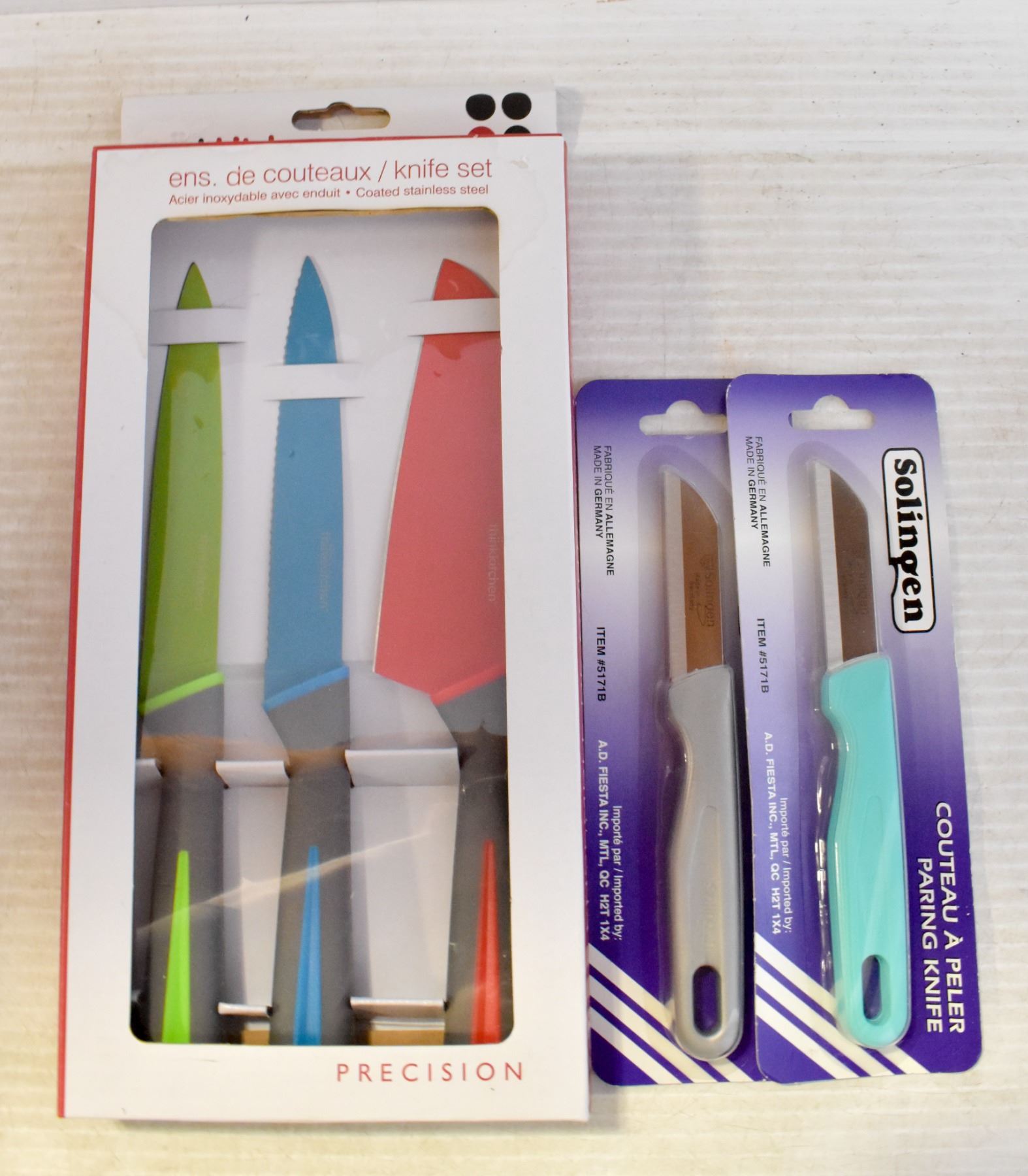 GERMAN PARING KNIVES AND A 3 PC THINK KITCHEN SET