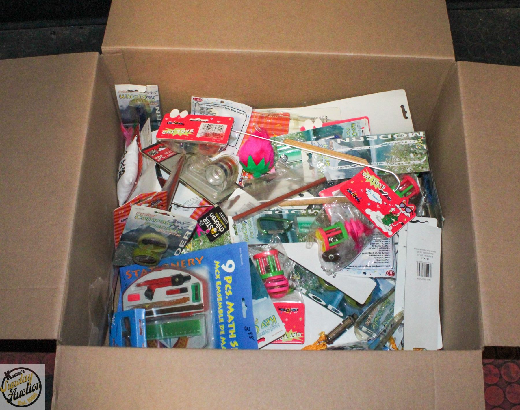 BOX OF NEW OLD STOCK TOYS, SCHOOL SUPPLIES