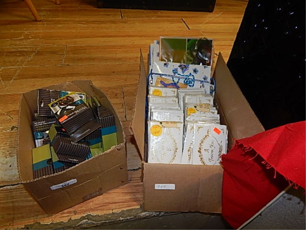 BOX OF NEW THANK-YOU CARDS AND NEW GIFT BAGS AND BOX OF NEW SUCTION CUPS