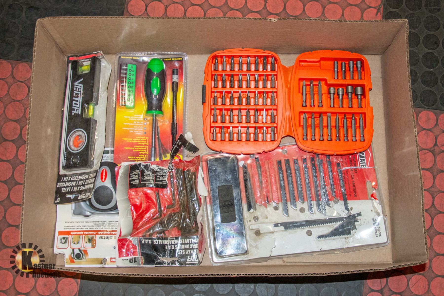 59-PIECE DRIVER SET IN CASE, JOBMATE 30-PIECE JIGSAW BLADE SET, 18-PIECE HEX KEYSET, VECTOR LEVEL, DURAMAX PRO DRIVER WITH FLEX EXTENSION, ETC. **ALL ITEMS MUST BE REMOVED BY 5PM SATURDAY, AUGUST 5TH 2023. ALL REMAINING ITEMS WILL BE SUBJECT TO A $6.00 PER DAY STORAGE CHARGE. ANY ITEMS REMAINING AFTER MONDAY, AUGUST 21ST, 2023 WILL BE CONSIDERED FORFEITED. NO REFUNDS WILL BE ISSUED FOR FORFEITED ITEMS. TO SCHEDULE A PICK UP APPOINTMENT CLICK HERE