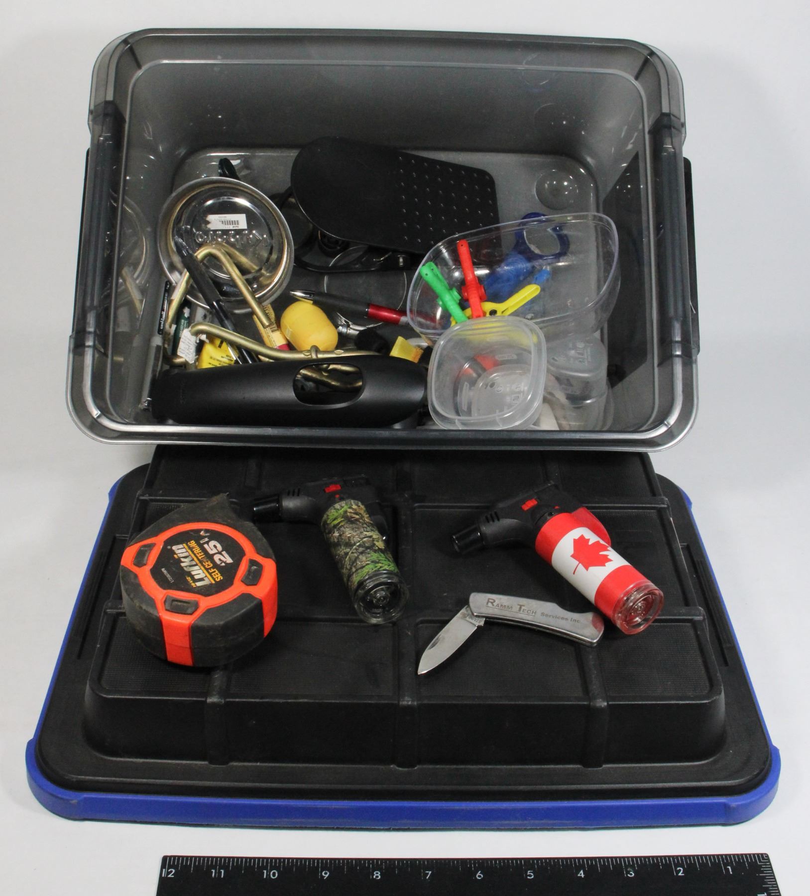 TAPE MEASURE, LIGHTERS (UNTESTED), PARTS TRAY, AND MORE