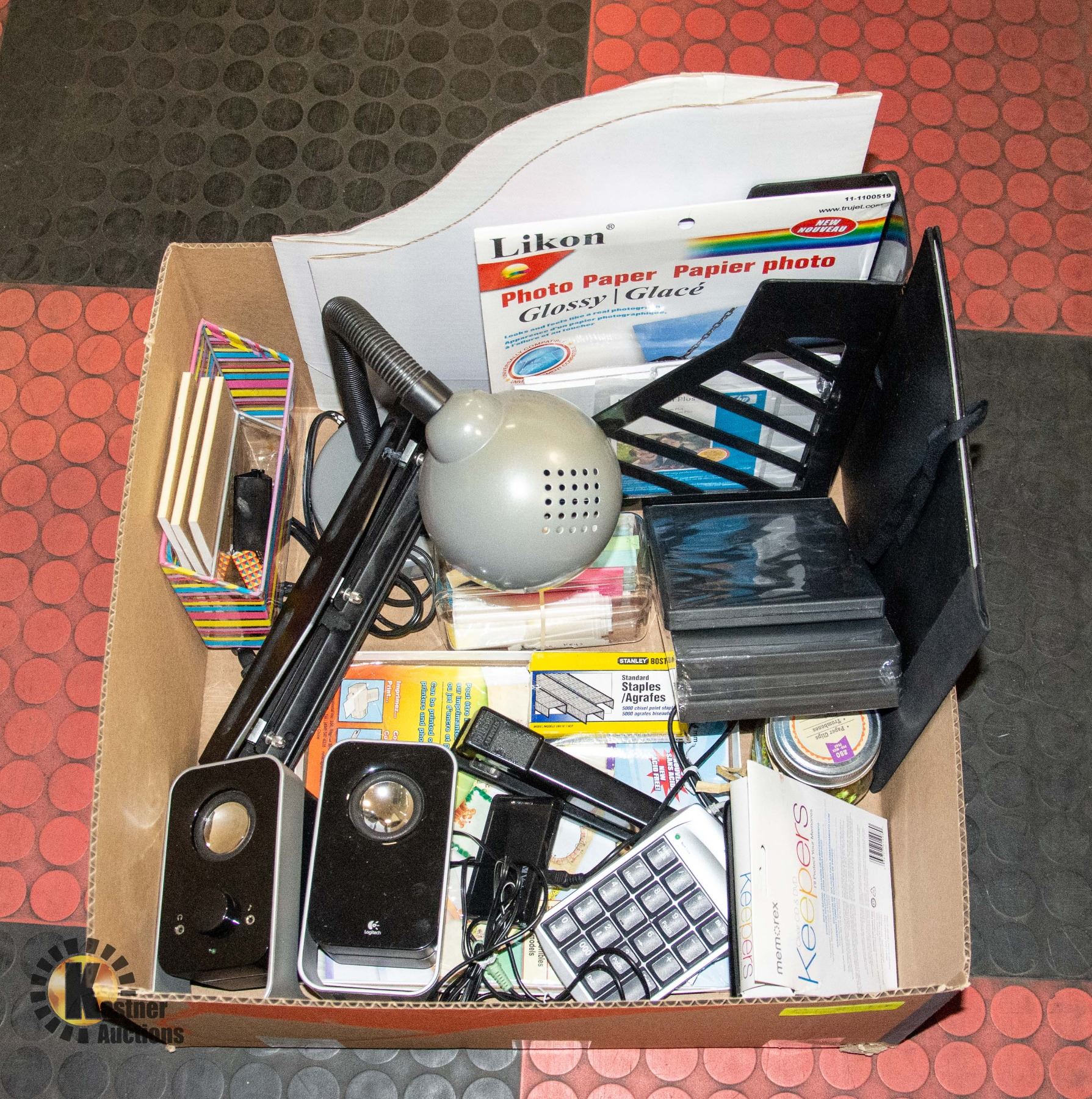 LOGITECH SPEAKERS, TARGUS SIDE CALCULATOR, DESK LAMP, STAPLER, 3-HOLE PUNCH, PAPER, PHOTO PAPER, SORTERS, POST ITS, ETC.