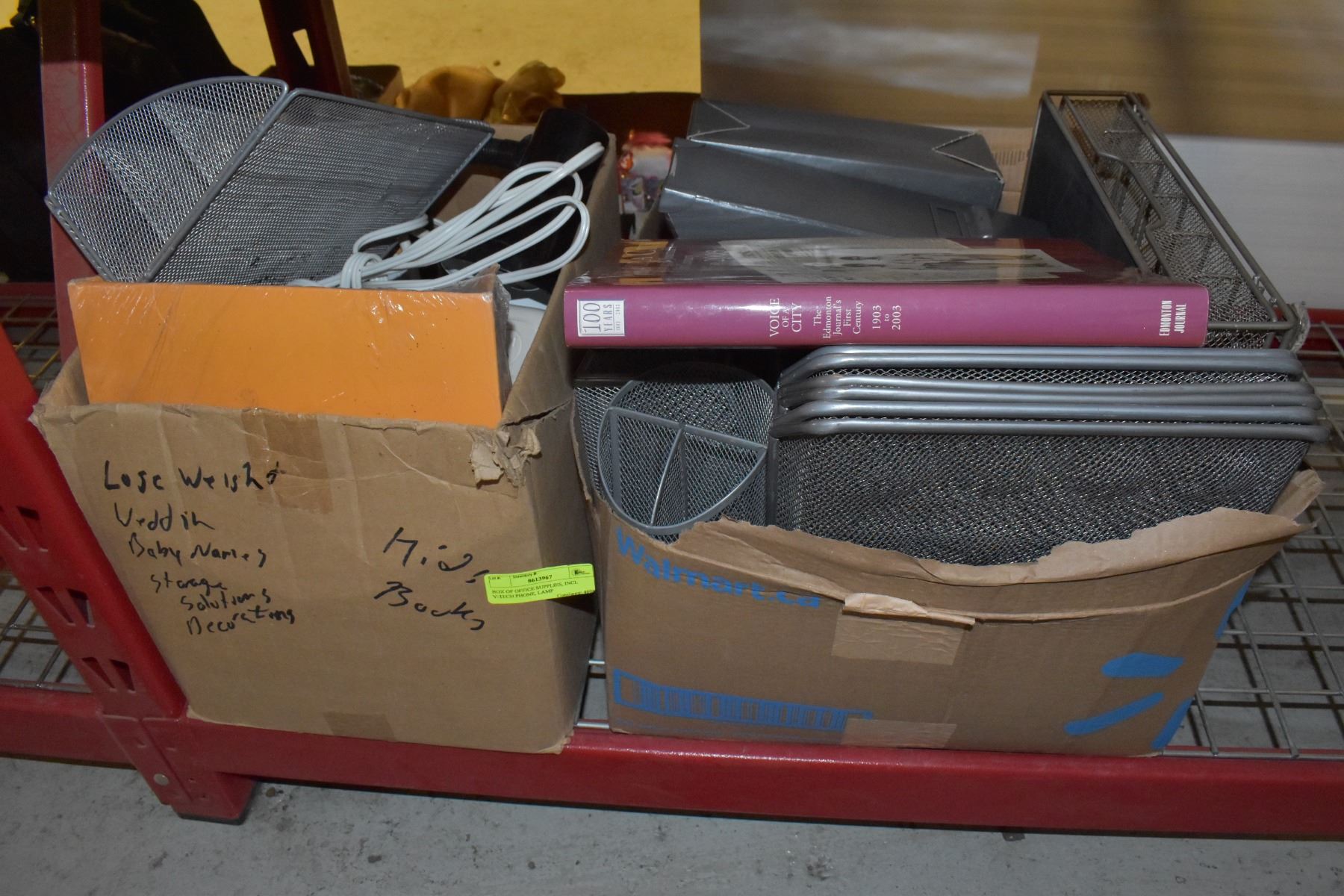 BOX OF OFFICE SUPPLIES, INCL V-TECH PHONE, LAMP