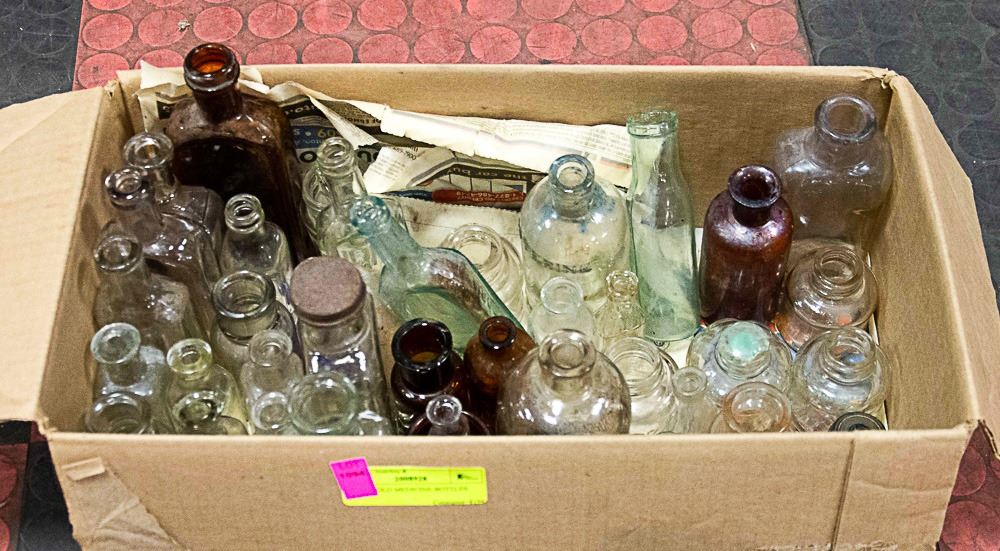 BOX OF OLD MEDICINE BOTTLES