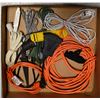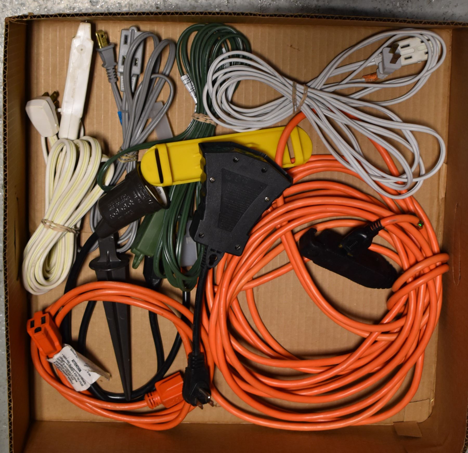 50 FT. OUTDOOR 3-TAP, OUTDOOR SINGLE TO 3-TAP EXTENSION, CAST METAL FLOOD LIGHT, 10 FT. OUTDOOR SINGLE TAP EXTENSION, 4 INDOOR EXTENSION CORDS, ETC.