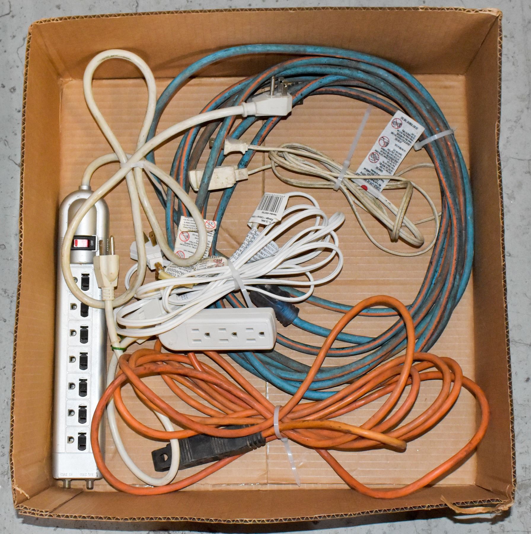 BOX OF OUTDOOR EXTENSION CORDS, SURGE