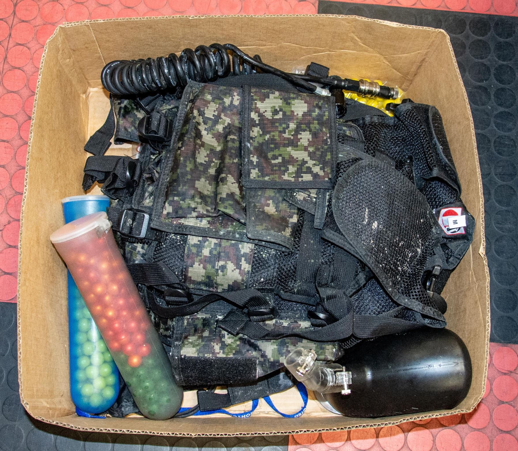 BOX OF PAINTBALL GEAR, EMPTY CANISTERS PAINTBALLS