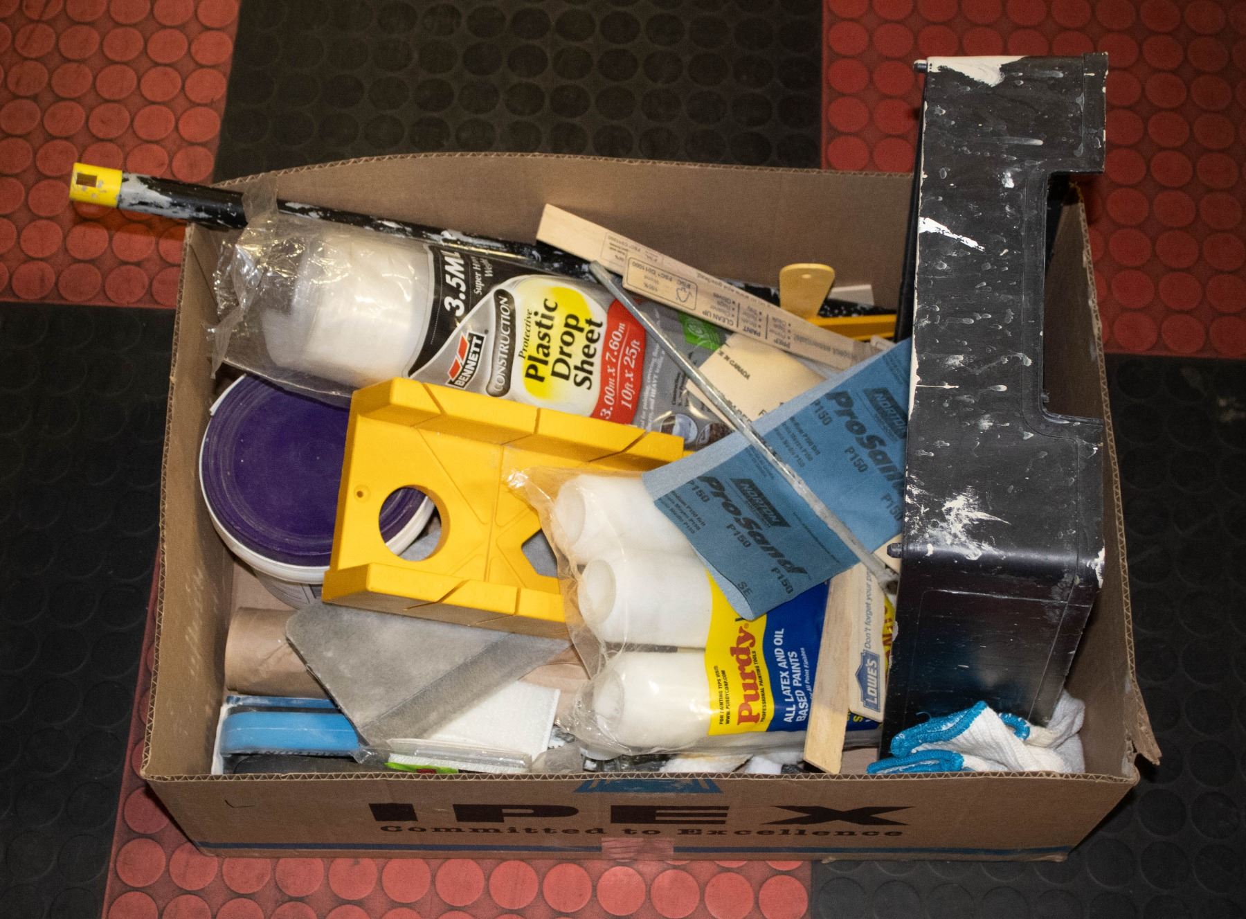 NEW ROLLERS, NEW DROP SHEET, NEW GLOVES, PAINT TRAY, PAINT MIXING DRILL ATTACHMENT, SAND PAPER, NEW FOAM BRUSHES, NEW TRIM PADS, MITER BOX WITH SAW, ETC. **ALL ITEMS MUST BE REMOVED BY 5PM SATURDAY, DECEMBER 16TH 2023. ALL REMAINING ITEMS WILL BE SUBJECT TO A $6.00 PER DAY STORAGE CHARGE. ANY ITEMS REMAINING AFTER TUESDAY, JANUARY 2ND 2023 WILL BE CONSIDERED FORFEITED. NO REFUNDS WILL BE ISSUED FOR FORFEITED ITEMS. TO SCHEDULE A PICK UP APPOINTMENT CLICK HERE