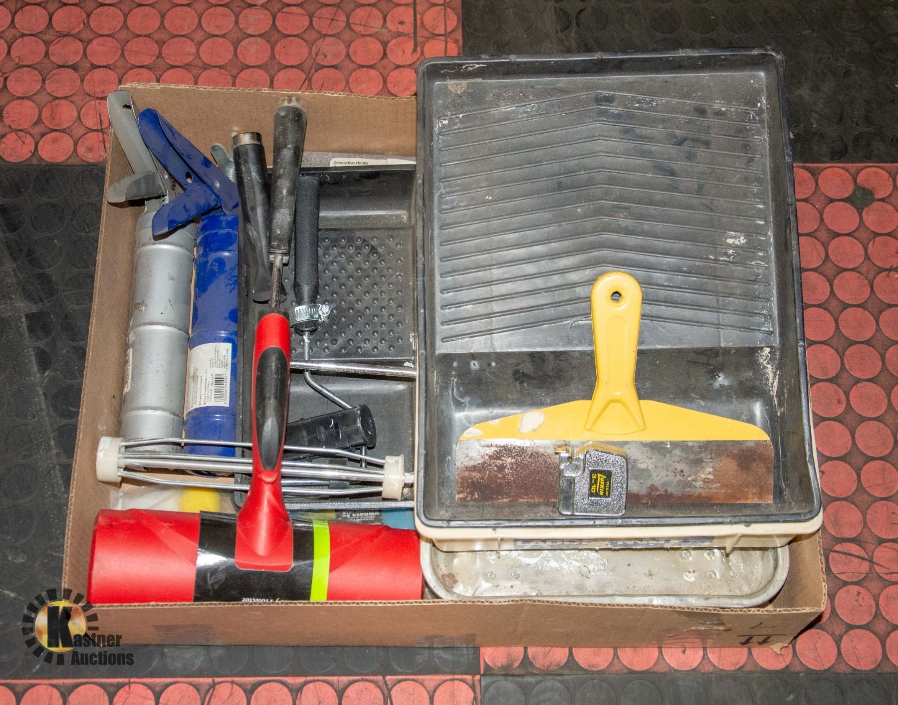BOX OF PAINTING SUPPLIES, TOOLS AND