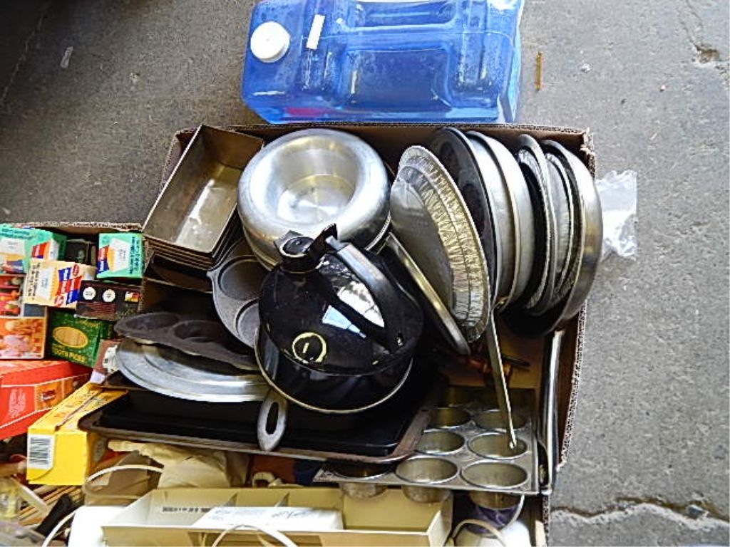 BOX OF POTS, PANS AND BAKING